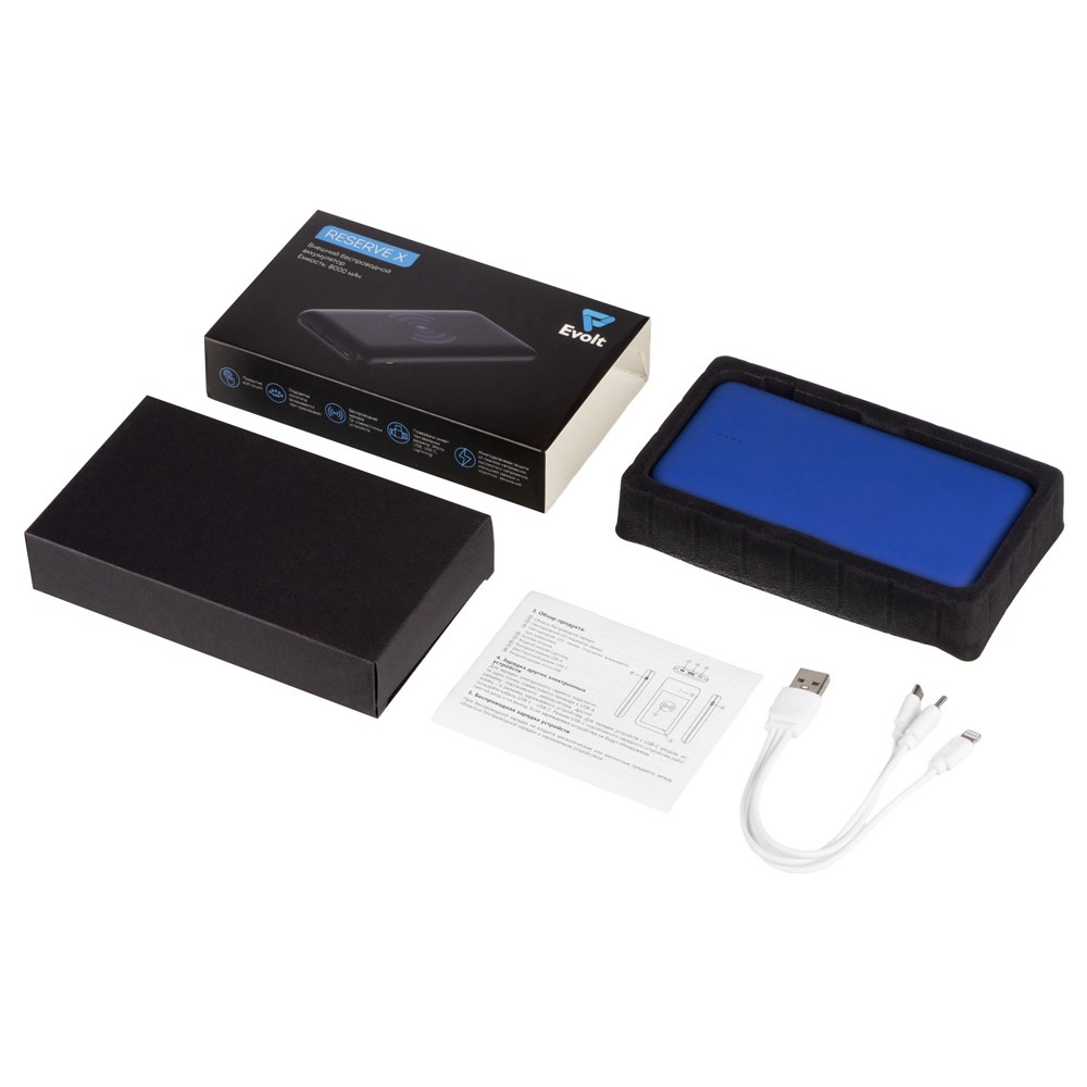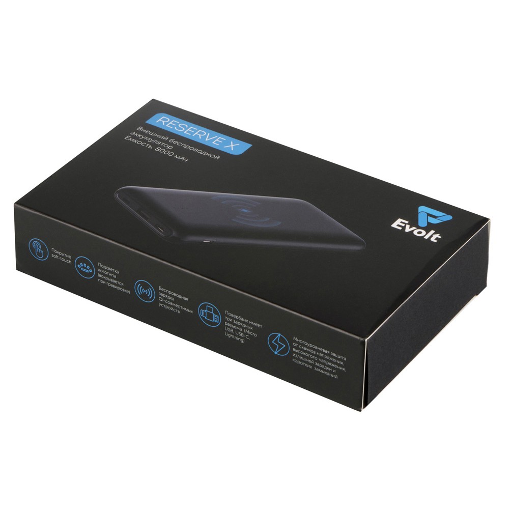 Корпус внешнего беспроводного аккумулятора Reserve X от Evolt покрыт soft touch, а при гравировке открывает подсветку логотипа. Гравировку можно компоновать с УФ-печатью, что позволит создать интересное сочетание подсвеченного контура и цветного изображения. Это — не единственный плюс: Reserve X имеет беспроводную зарядку Qi-совместимых устройств, а еще — многоуровневую защиту от нестабильного напряжения и замыканий, которая обезопасит и аккумулятор, и заряжаемый гаджет. Зарядить повербанк можно через 3 порта, зарядить от него устройство — через 2.
