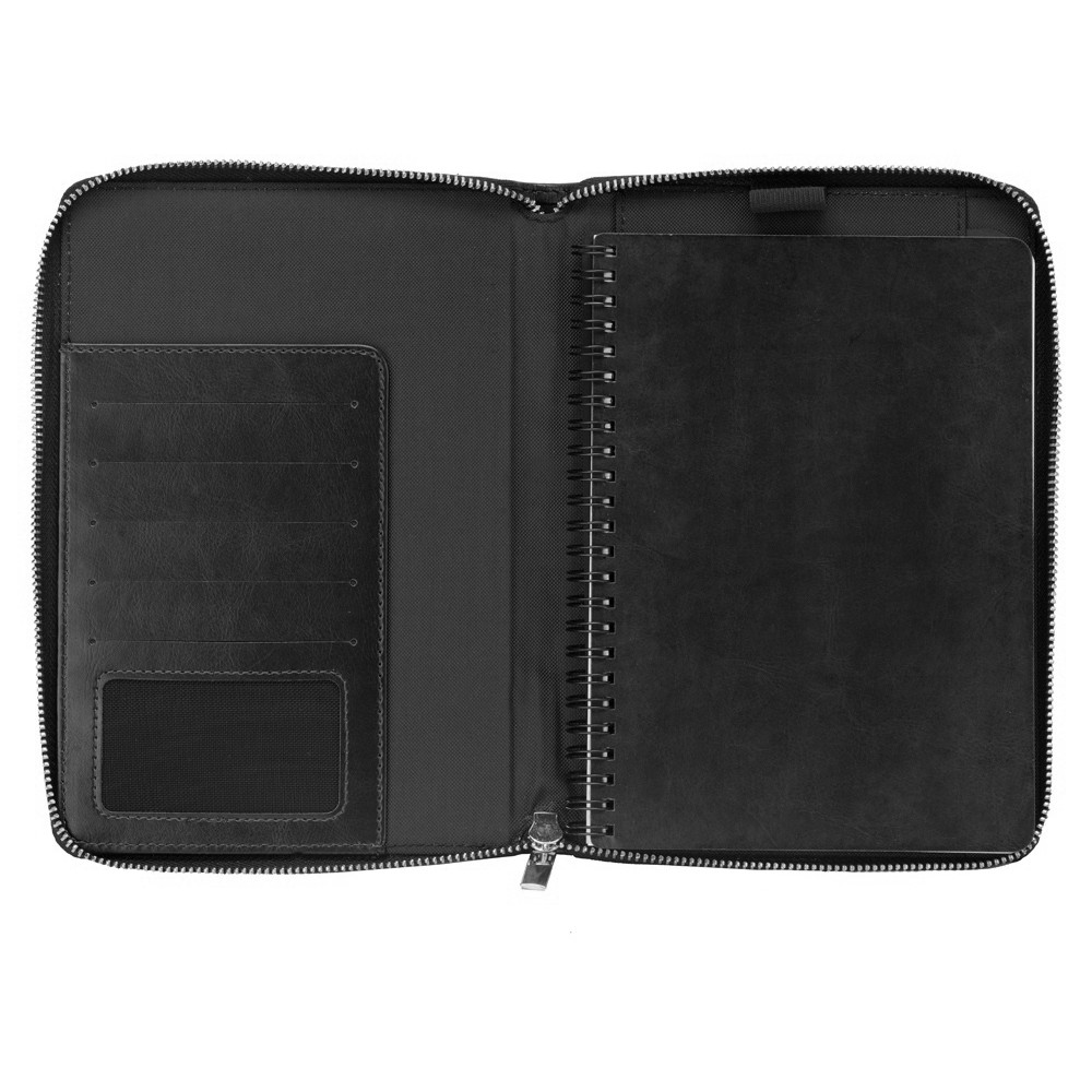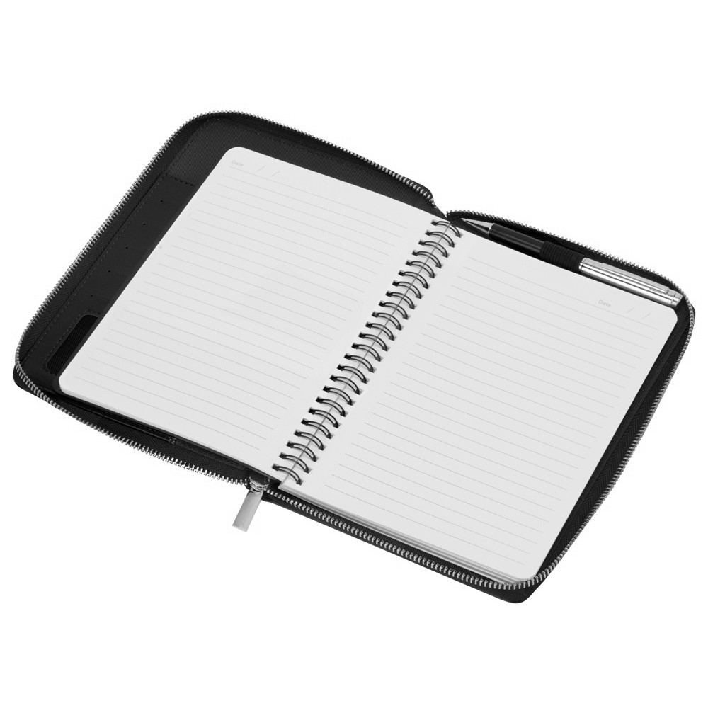 Бизнес блокнот Fabrizio состоит из пенала на молнии выполненного из искусственной кожи, и сменной тетради на 80 листов на кольцах с перфорированными линованными листами белого цвета.