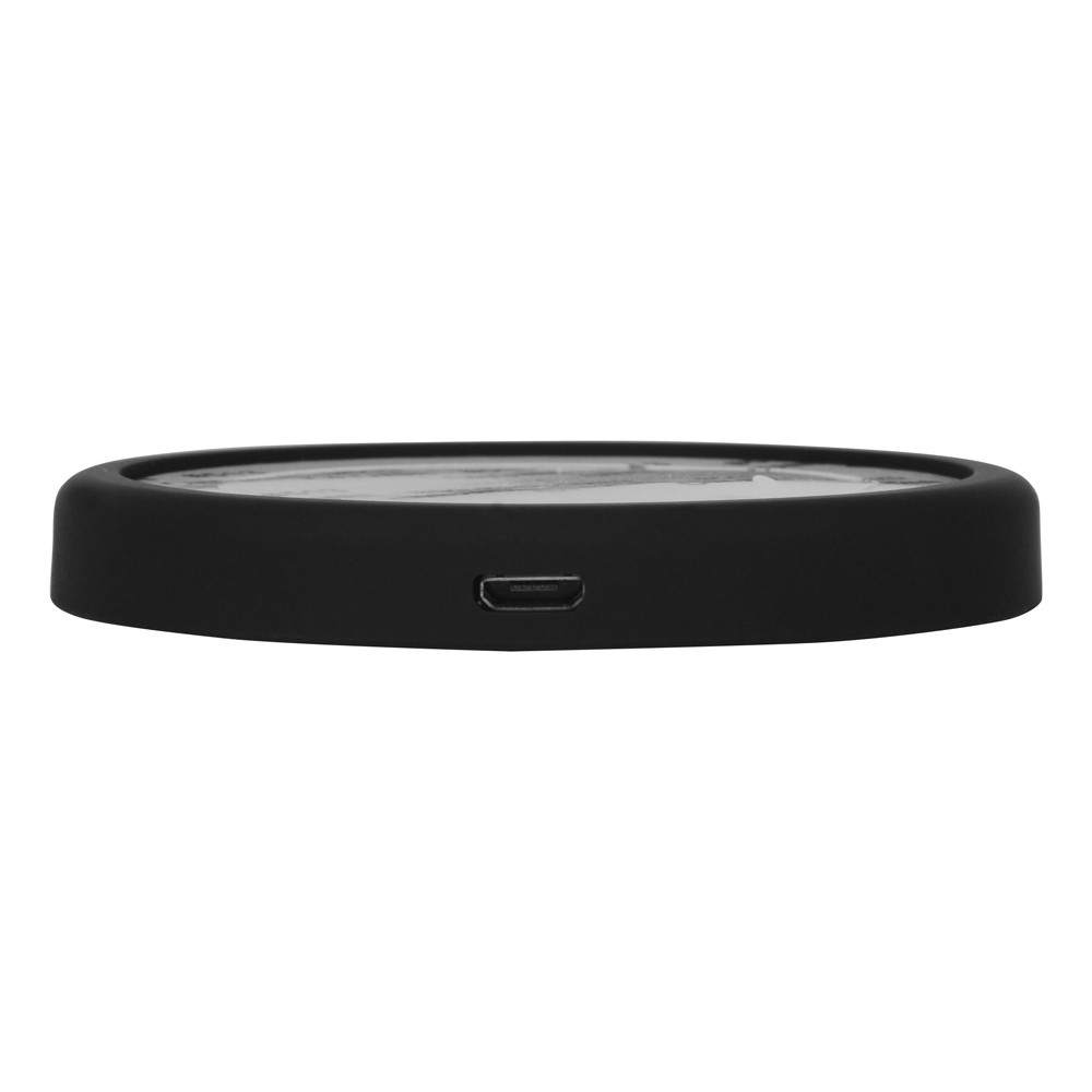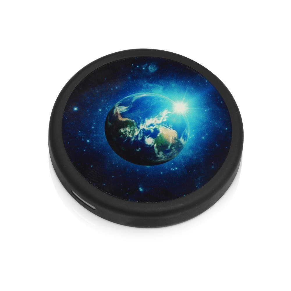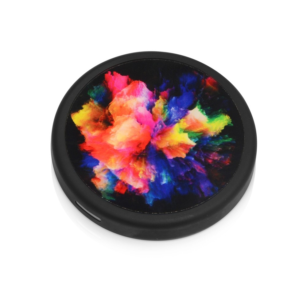 Благодаря миниатюрному размеру устройства и идеальной форме круга, вы не сразу угадаете его назначение. Этот предмет создан для тех, кто предпочитает гармонично встраивать технологии в ежедневную жизнь, деликатно скрывая их под маской обычных вещей. Главная функция устройства — беспроводная зарядка — реализуется качественно и бесперебойно. В комплекте с изделием в разобранном виде поставляется круглое закаленное стекло, на котором можно сделать красочное нанесение любого изображения. После запечатки стекло легко крепится на корпус устройства.
