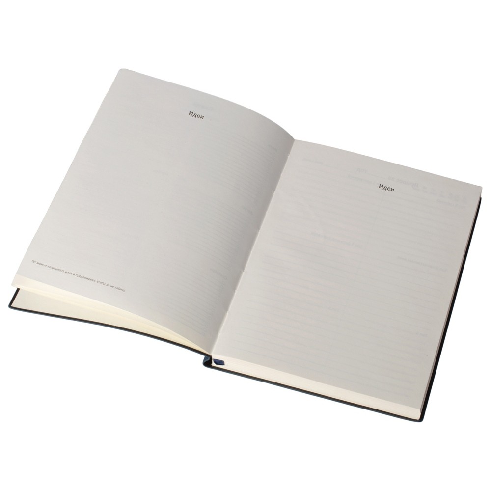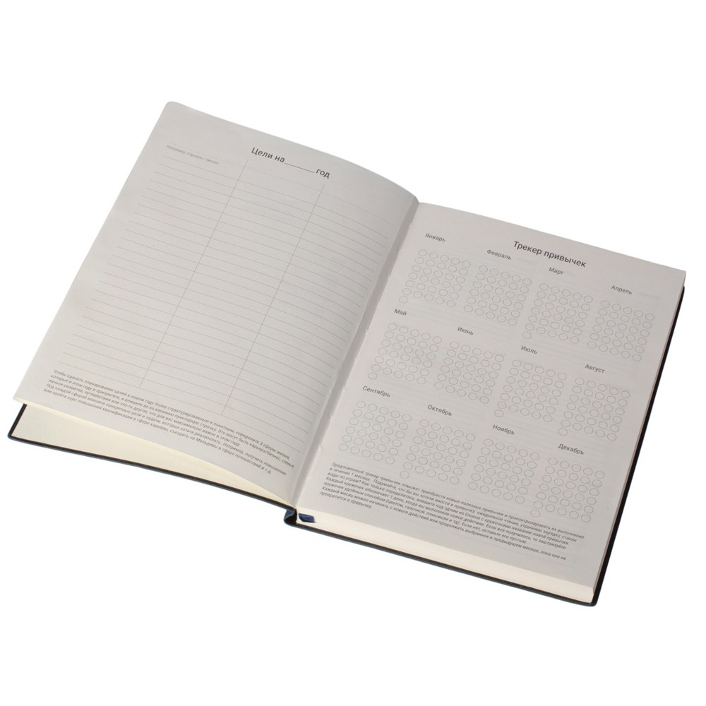 Бумажный блок выполнен из бумаги, полученной из древесины из специальных восполняемых лесных ресурсов, имеет сертификат FSC, международной некоммерческой организации лесного попечительского совета. Линовка — недатированный ежедневник, а на первых страницах вы встретите специальные листы для постановки целей на год и подведения итогов, а также другие трекеры.