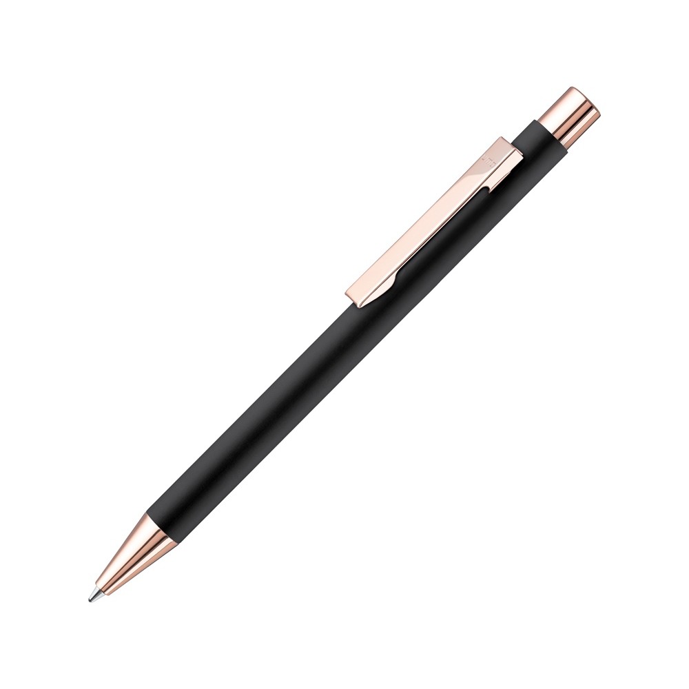 Металлическая шариковая ручка с мягким на ощупь корпусом в черном цвете, металлическим клипом, металлическим наконечником, кнопкой с глянцевой розово-золотой отделкой.