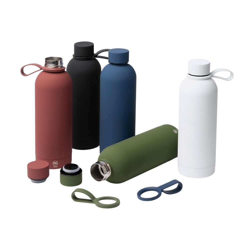 Термобутылка из переработанной нержавеющей стали 304. Мягкая прорезиненная поверхность на корпусе. Удобная силиконовая ручка для переноски. Оснащена противокапельной системой благодаря силиконовому кольцу, встроенному во внутреннюю часть крышки. Крышка и ручка соответствуют цвету корпуса. Объем: 500 мл.