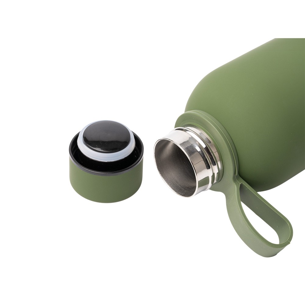 Термобутылка из переработанной нержавеющей стали 304. Мягкая прорезиненная поверхность на корпусе. Удобная силиконовая ручка для переноски. Оснащена противокапельной системой благодаря силиконовому кольцу, встроенному во внутреннюю часть крышки. Крышка и ручка соответствуют цвету корпуса. Объем: 500 мл.