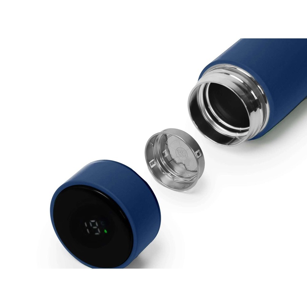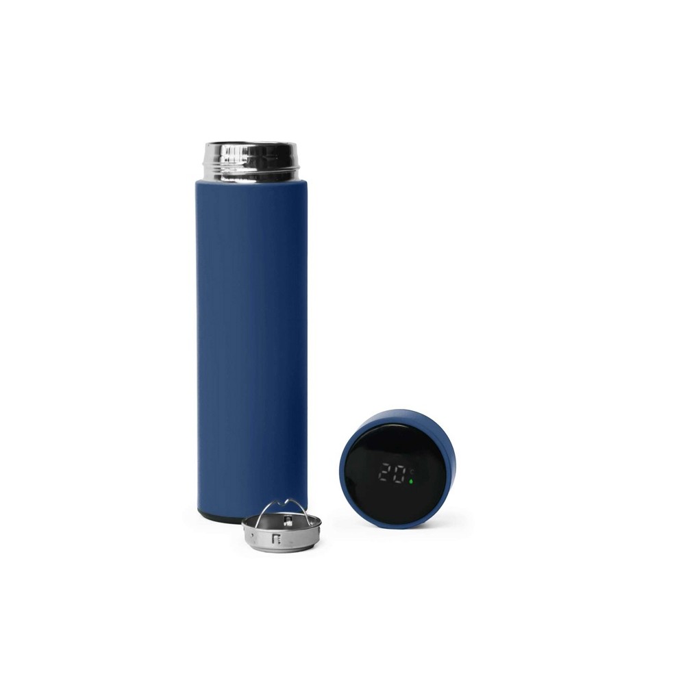 Термос из нержавеющей стали, покрытый цветным soft touch, с крышкой, в которой встроен термометр и LED дисплей, показывающий температуру внутри термоса. Объем: 500 мл. Упаковка: каждый термос в крафт коробке.