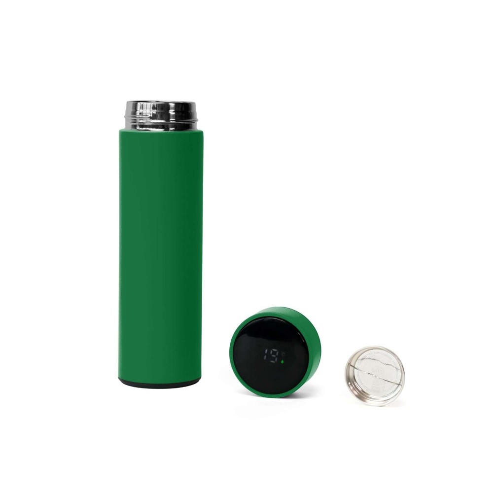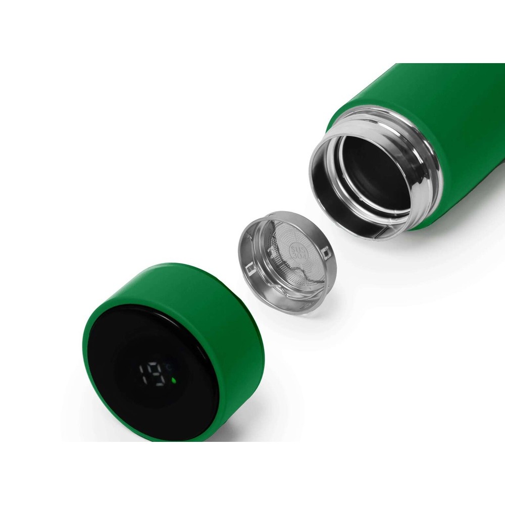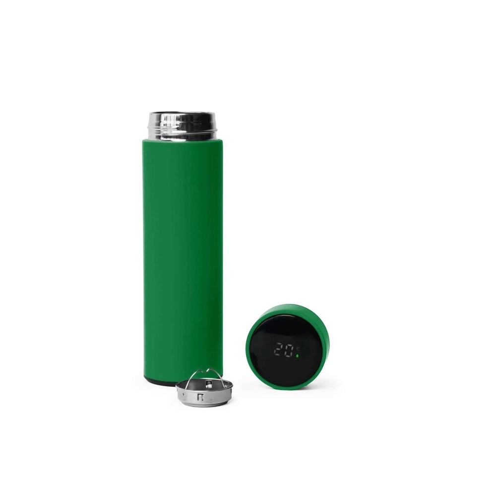 Термос из нержавеющей стали, покрытый цветным soft touch, с крышкой, в которой встроен термометр и LED дисплей, показывающий температуру внутри термоса. Объем: 500 мл. Упаковка: каждый термос в крафт коробке.
