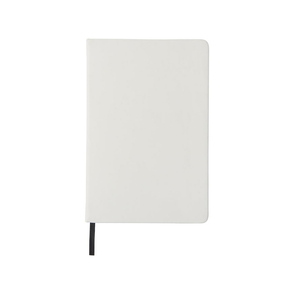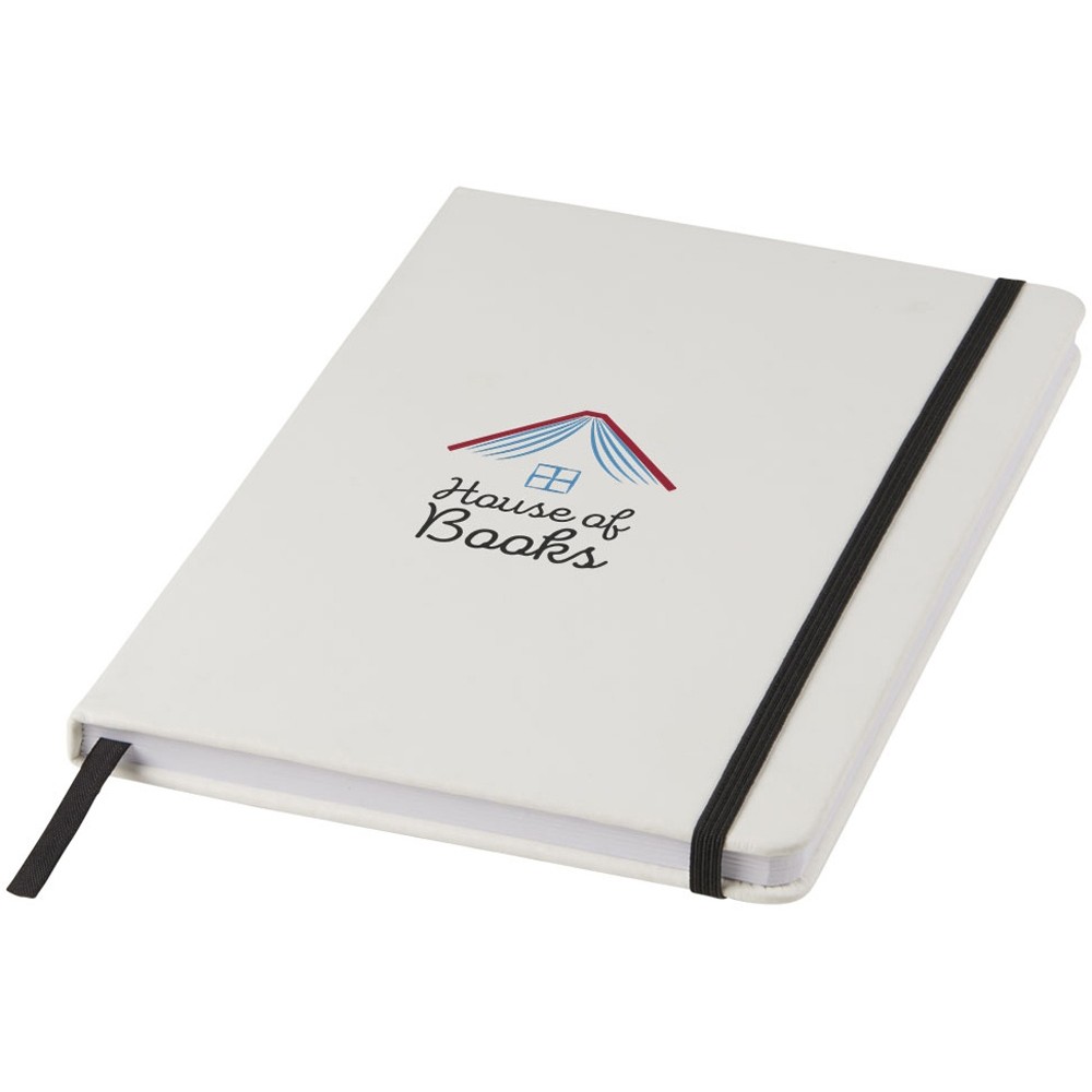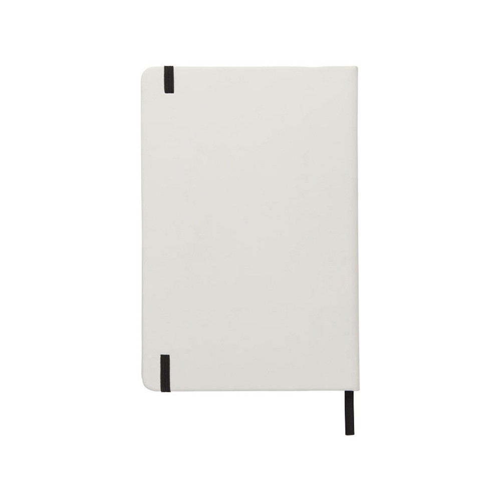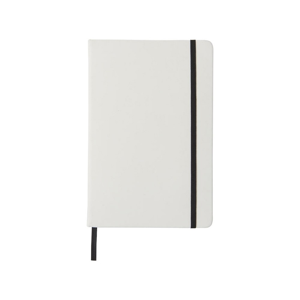 Белый блокнот A5 с цветной эластичной закладкой и резинкой. 96 страниц (60g/m2), линованная бумага. На обложке возможна цифровая печать.