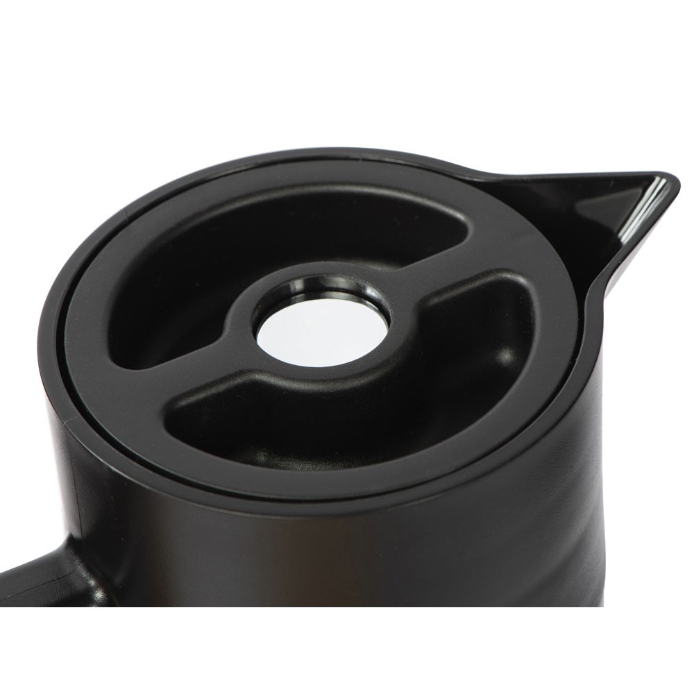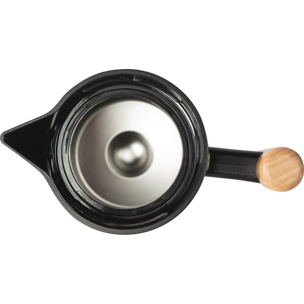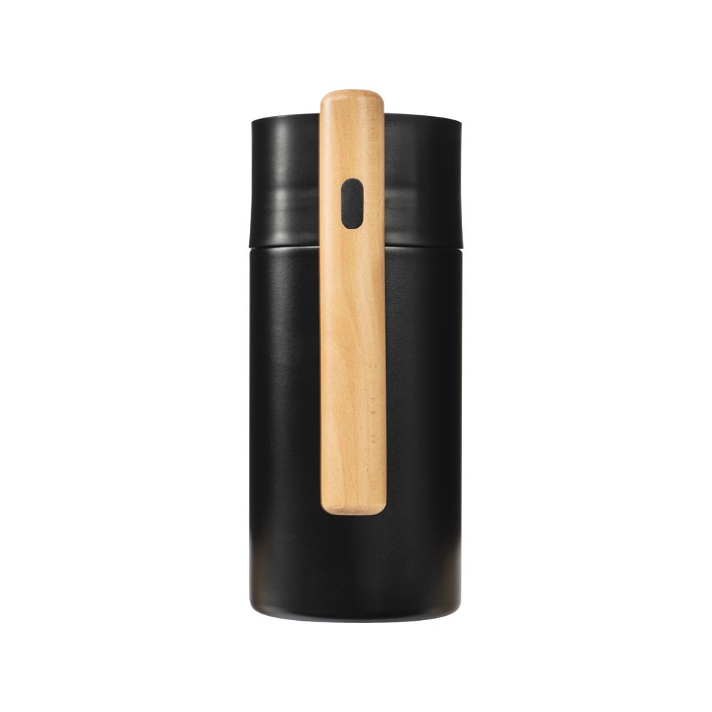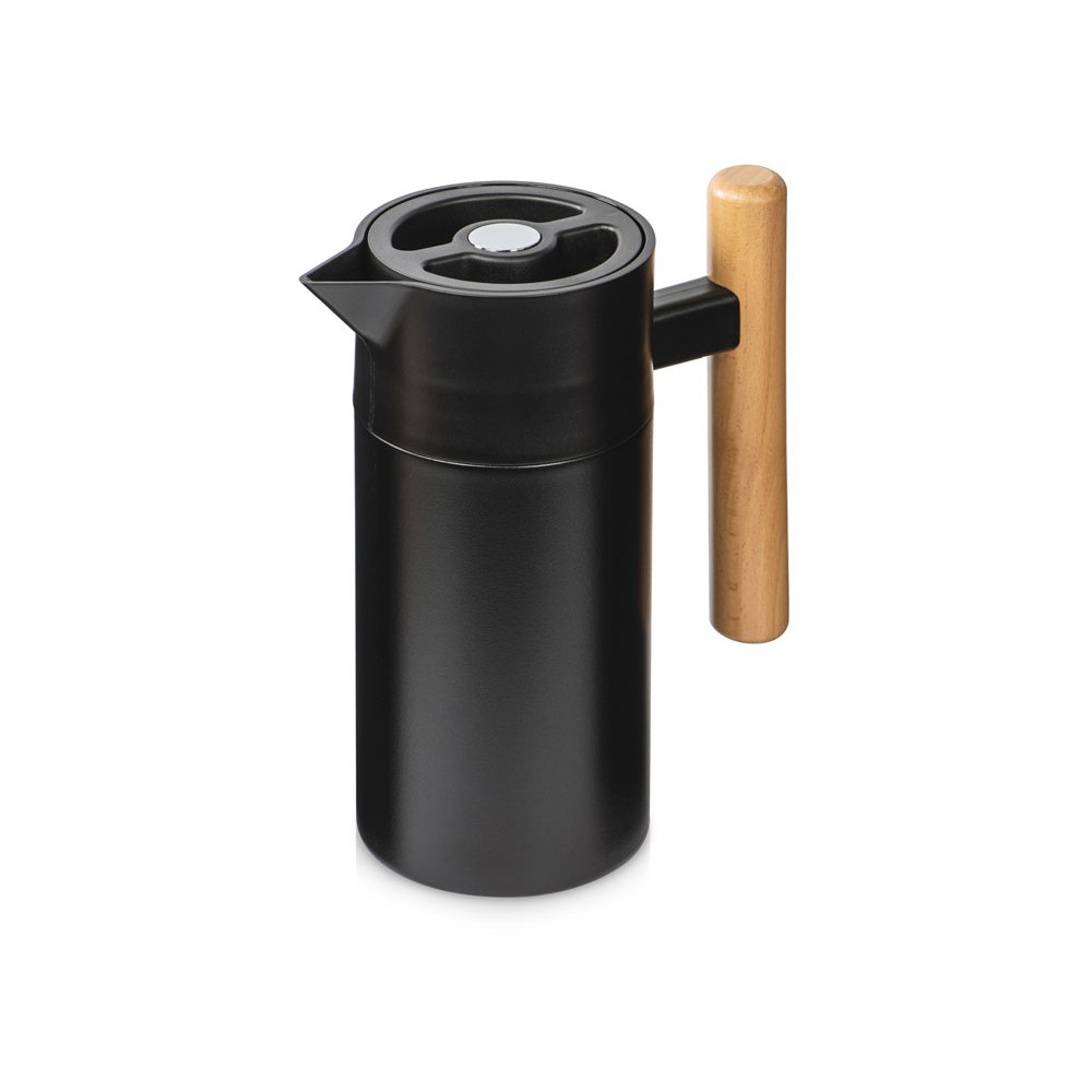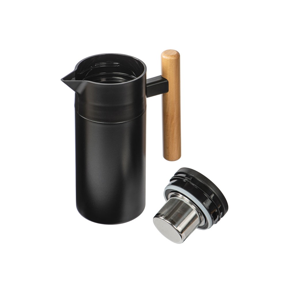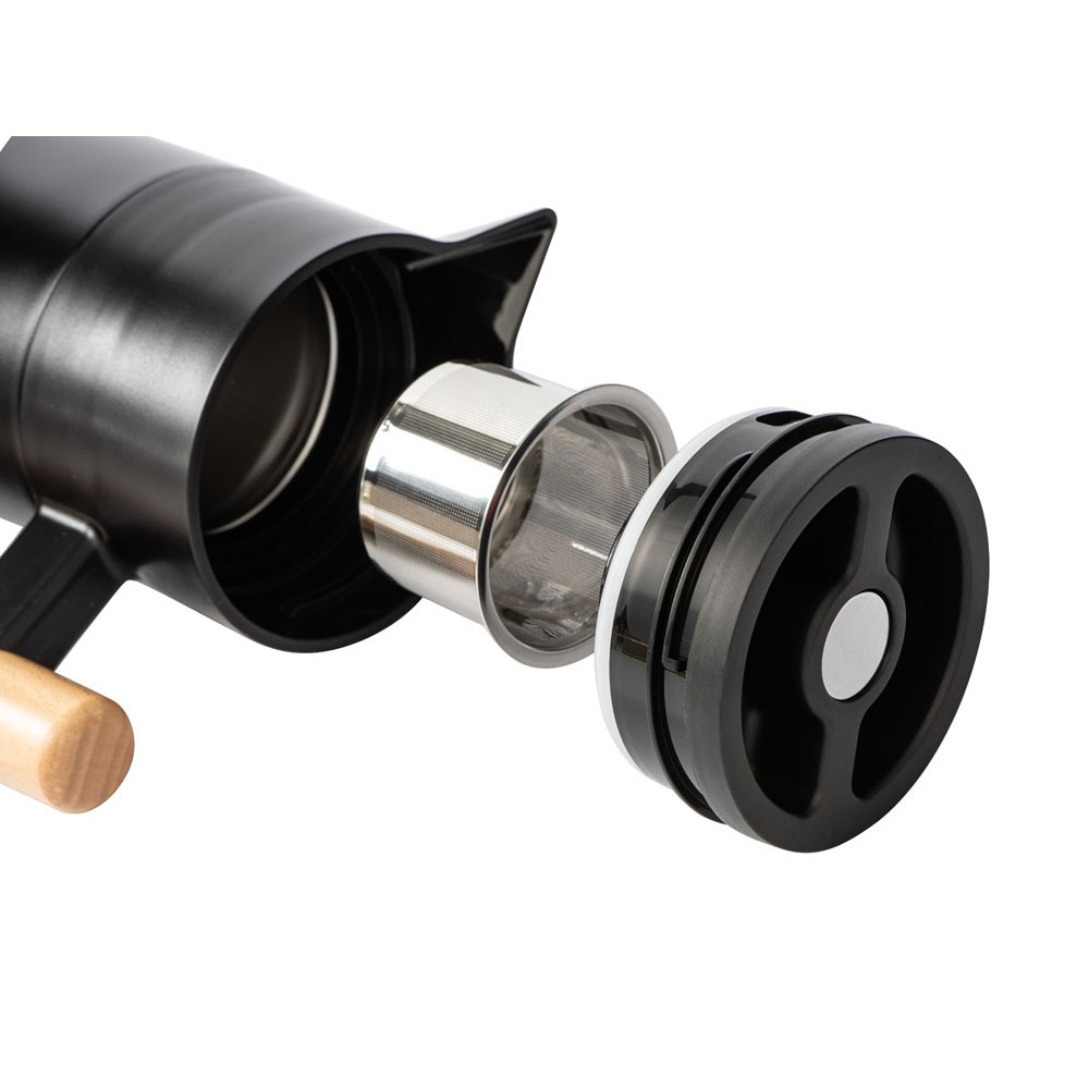 Вакуумный термокувшин черного цвета, подходит для чая и кофе. Сохраняет температуру в течение 24 часов благодаря двойным стенкам с вакуумной изоляцией. Съемное ситечко из нержавеющей стали можно мыть в посудомоечной машине, а деревянная ручка термопота делает его использование особенно удобным и безопасным. Объем термочайника — 1200 мл, этого хватит на 4 обычных чашки чая.