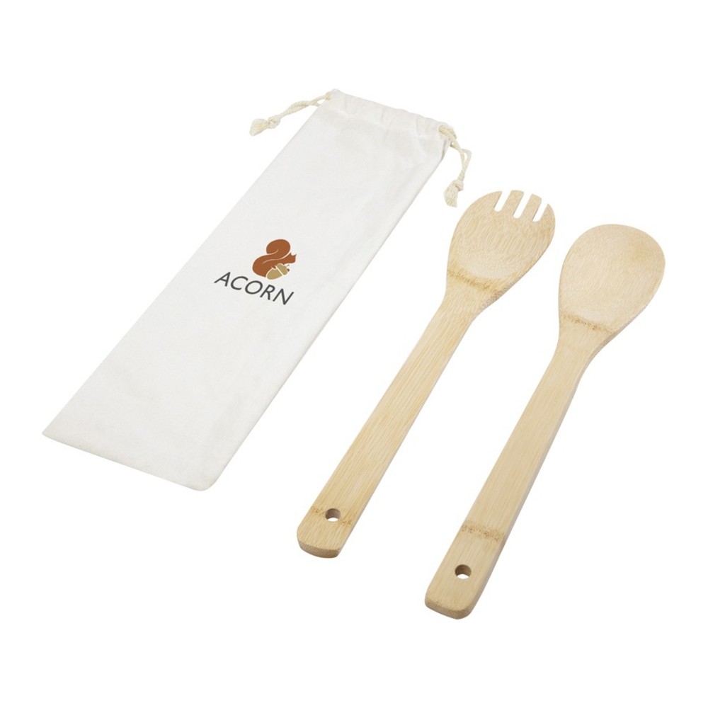 Бамбуковый комплект из салатной ложки и вилки, удобный для повседневных семейных ужинов. Используемый бамбук поставляется и производится в соответствии со стандартами устойчивого развития.
