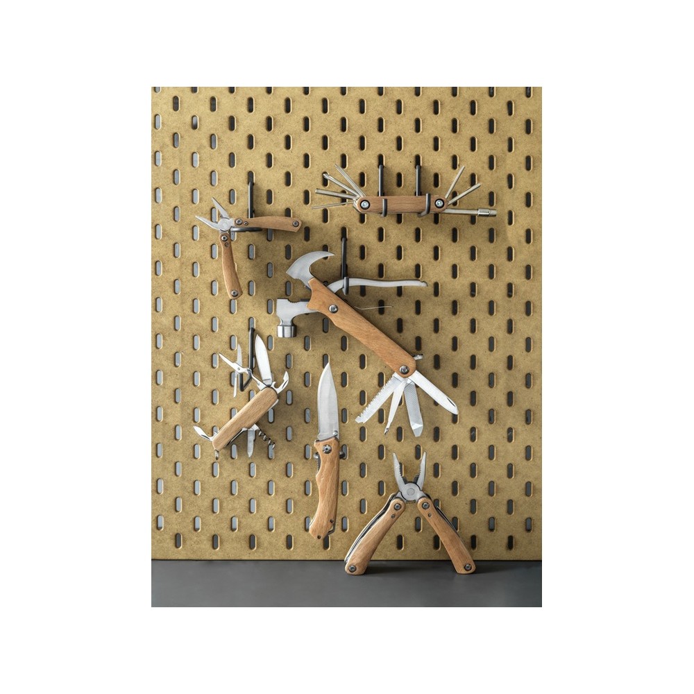 Прочный, долговечный и компактный многофункциональный инструмент из качественной нержавеющей стали с ручками из буковой древесины. Обязательный аксессуар для любого скаута, мастера и других любителей выживания или активного отдыха. Используемая буковая древесина поступает от надежных поставщиков, соблюдающих все экологические и социальные нормы. Размер этого многофункционального инструмента в открытом состоянии составляет 24 x 13 x 2 см, а в закрытом — 17,5 x 9 x 2 см. Имеет 10 функций: зажимные клещи, острогубцы, стандартные плоскогубцы, резак для проволоки, молоток, напильник, плоская отвертка, крестообразная отвертка, пила, нож и замок. Поставляется с инструкцией по эксплуатации в подарочной коробке из переработанного картона размером 20,5 x 10 x 3,5 см. В качестве экологически рационального варианта печати рекомендуется лазерная гравировка.