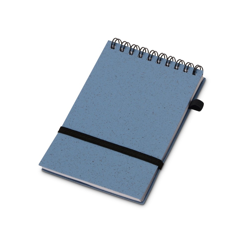 Блокнот с обложкой из переработанной пшеницы и пластика. Блок состоит из 60 листов переработанной бумаги белого цвета. Крепление - пружина. Дополнен петлей для ручки и горизонтальной резинкой.