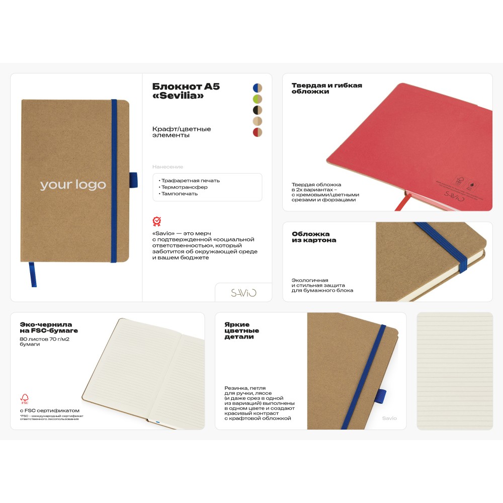 Sevilia от Savio — блокнот с твердой обложкой из крафта, закрывающийся на вертикальную резинку. Для удобства использования предусмотрены ляссе и петелька для ручки, совпадающие по цвету с резинкой.