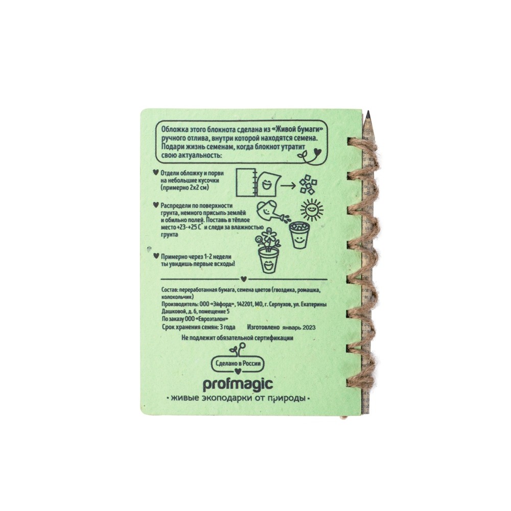 «Живой Блокнот» - это блокнот ручной работы с семенами гвоздики, ромашки и колокольчика внутри обложки. Блок на 50 листов сделан из экологичной неотбеленной бумаги, вместо пружины используется льняной шпагат. Блокнот поставляется с бумажным карандашом в наборе. После использования блокнота, вырвите обложку, порвите ее на кусочки и посадите в землю. Поливайте и уже через несколько недель вы увидите первые всходы.