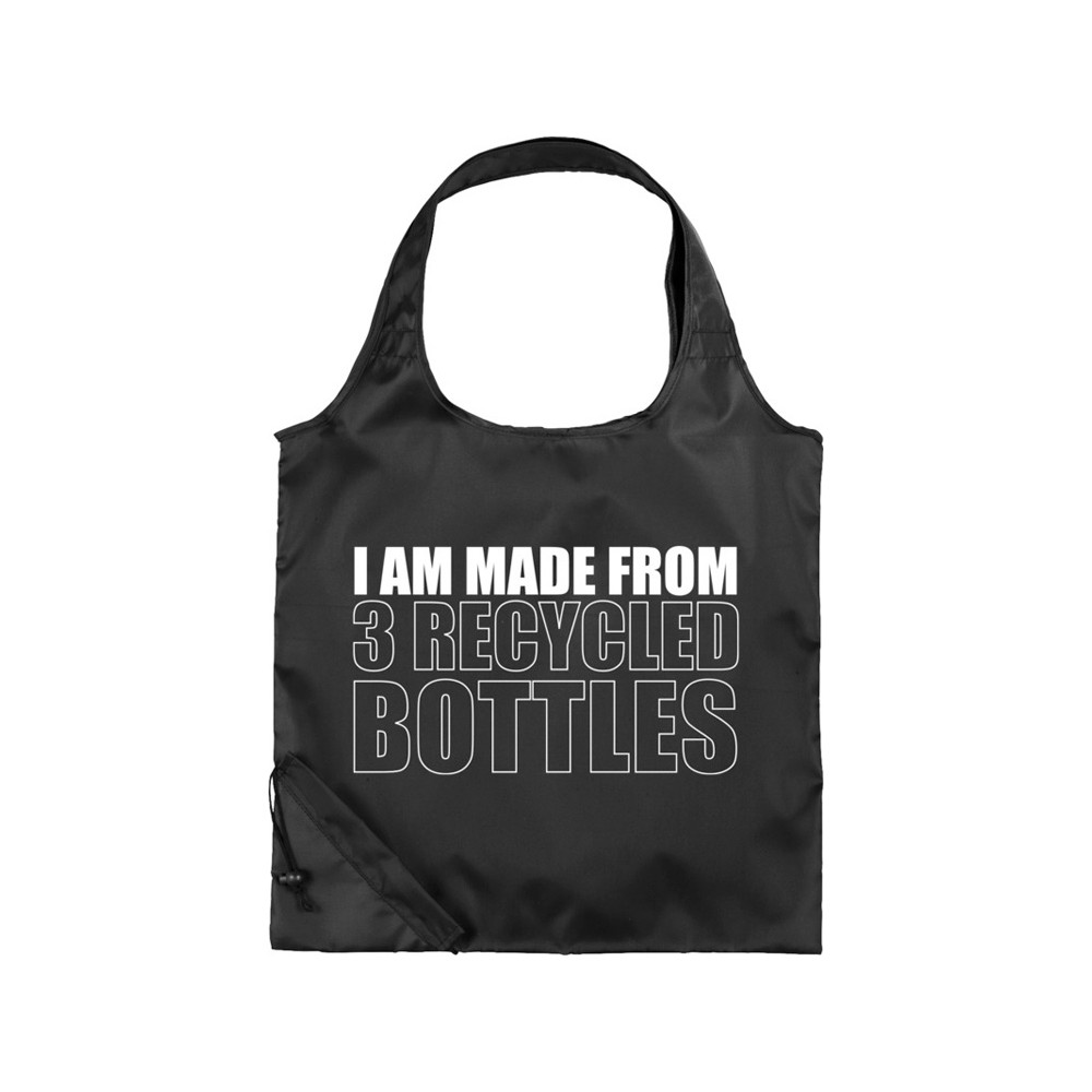 На одной из сторон сумки напечатан текст "I am made from 3 recycled bottles".