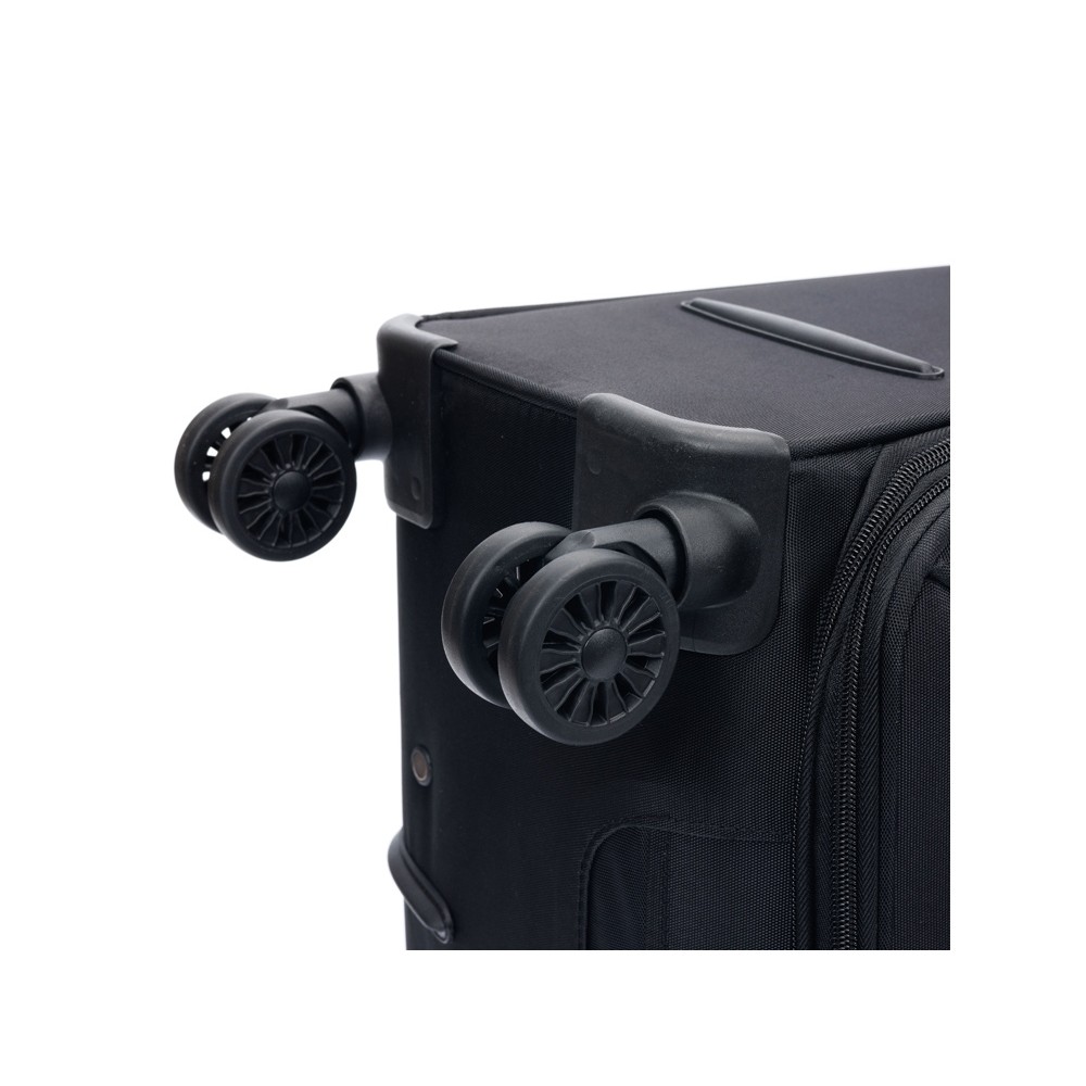 Легкая регулируемая телескопическая алюминиевая ручка и система из четырёх двойных колёс, вращающихся на 360 градусов, обеспечивает мягкий ход и свободное движение во всех направлениях.