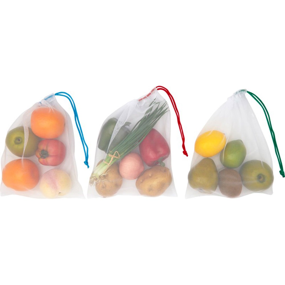 Набор из 3 сетчатых сумок из вторичного ПЭТ. Сумки многоразового использования, их можно использовать для фруктов и овощей как альтернативу пластиковым пакетам. У всех сумок есть затягивающий шнурок. Переработанный PET пластик.