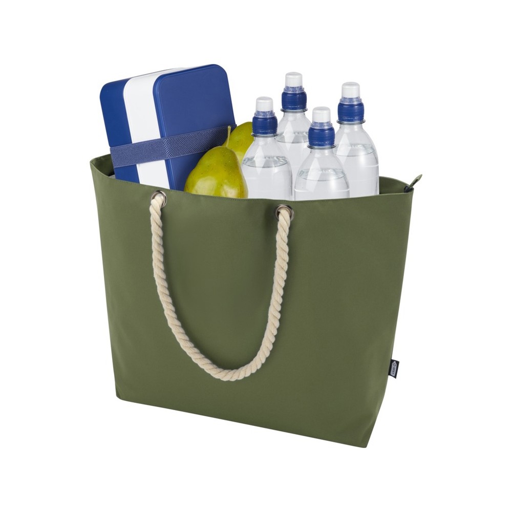 Эко-сумка холодильник Panama изготовлена из переработанного полиэстера, сертифицированного согласно GRS, и имеет большое основное отделение на молнии, а также высококачественную алюминиевую фольгу и ручки из хлопкового шнура. Подходит для различных мероприятий, таких как поход за продуктами или для дня на пляже или в парке. Объем: 23 литр. Выдерживает вес до 10 кг. Не содержит ПВХ. GRS certified recycled polyester.