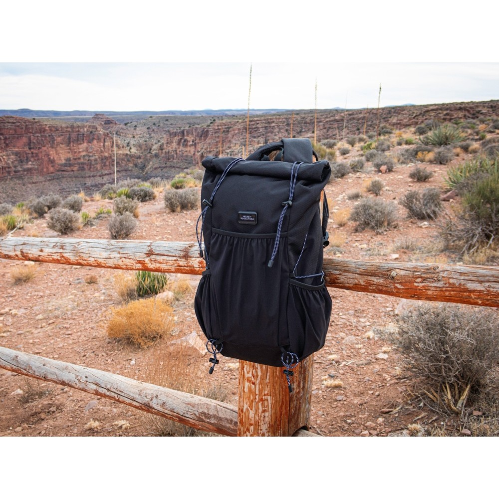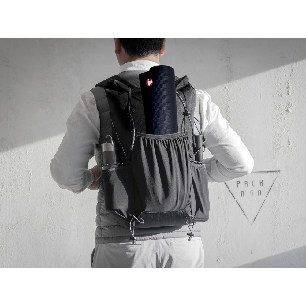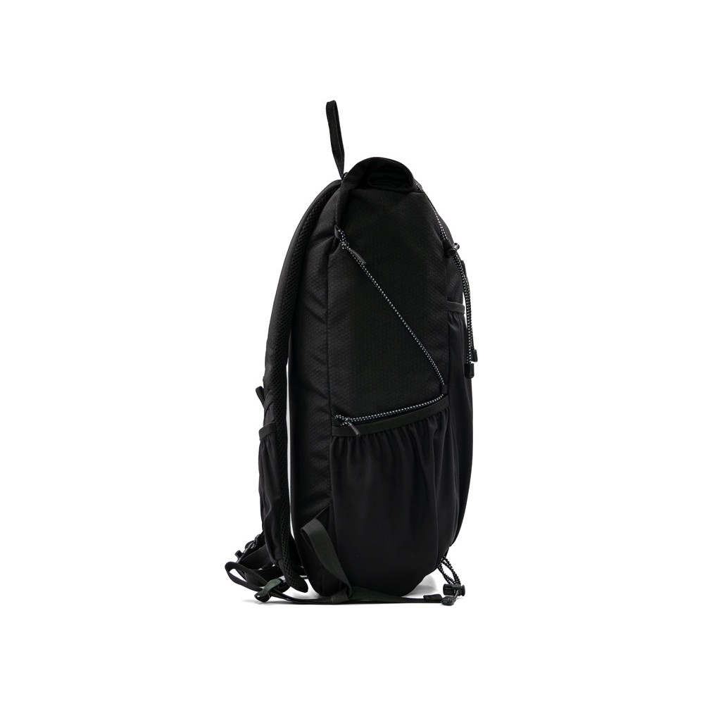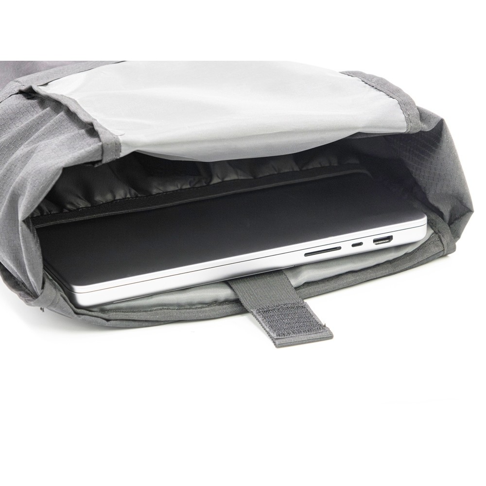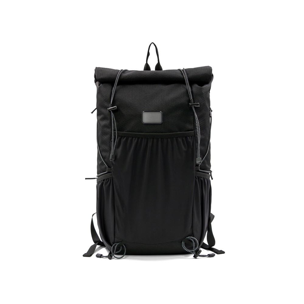 Легкий, элегантный, складывающийся рюкзак вместителен и удобен благодаря системе закрытия основного отделения roll-top, наличию трех наружных карманов спереди и по бокам из прочной эластичной сетки и внутреннему плотному карману для ноутбука до 16". Лямки с эластичными карманами для карт, телефона и других мелочей фиксируются на груди пряжкой, которую можно отрегулировать по высоте под ваш рост. Эластичные фиксирующие шнурки имеют светоотражающее нанесение, что обеспечивает дополнительную защиту в темное время суток. Дышащая сетка на спинке обеспечивает удобство и комфорт. На нагрудной пряжке предусмотрен свисток для экстренного случая. Водостойкая ткань верха изготовлена из переработанного пластика, пропитана специальным составом против загрязнения. В комплекте металлический шильд для нанесения вашего логотипа.
