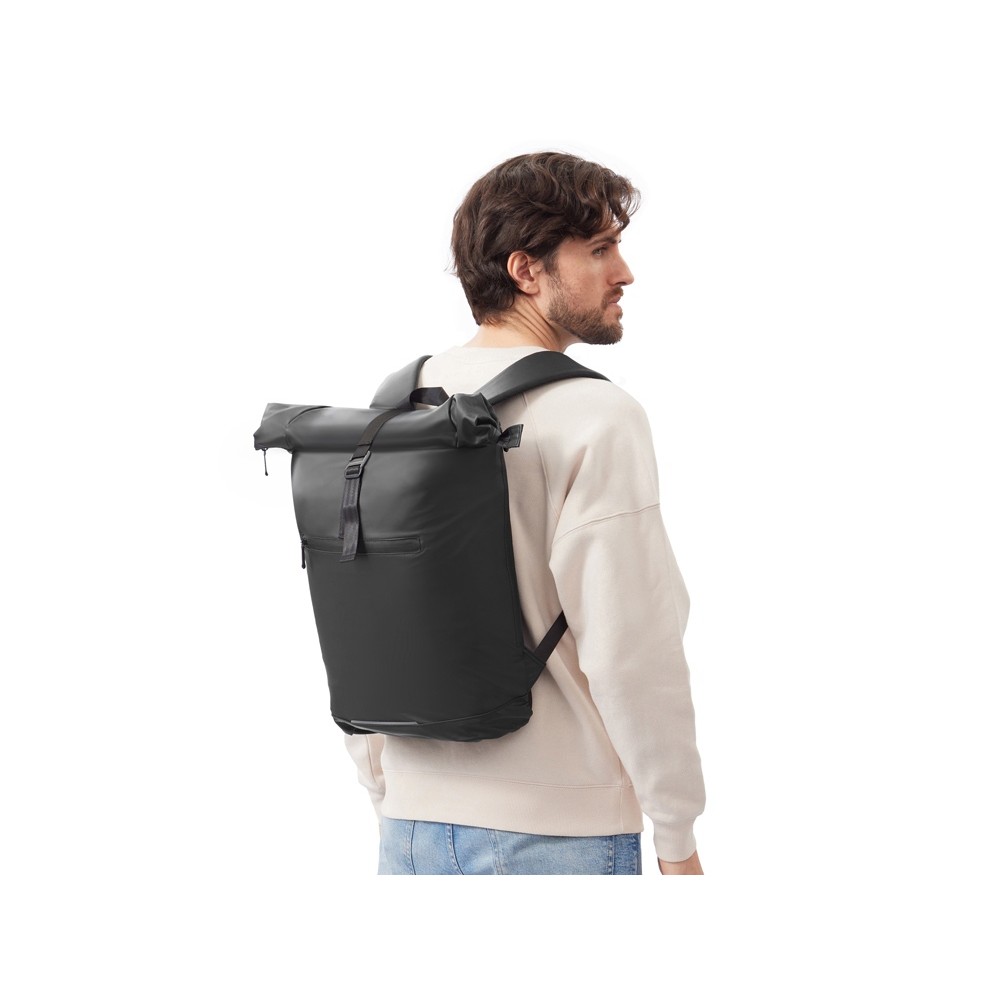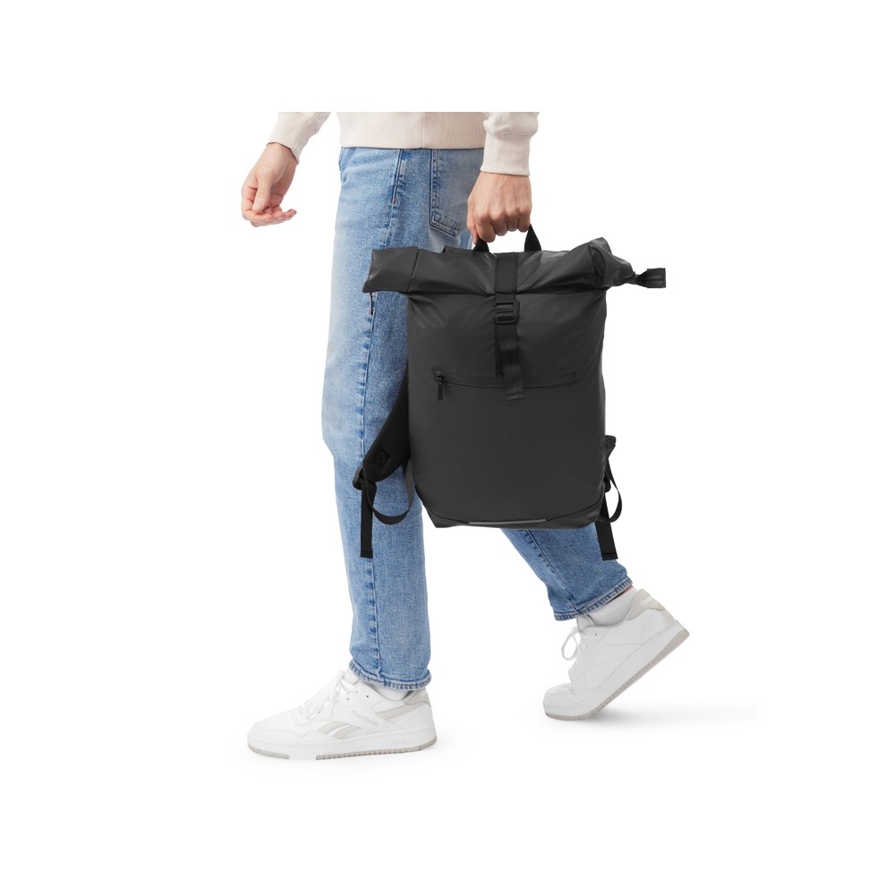 Легкий и удобный рюкзак для передвижения по городу и поездок. Основное отделение водостойкого рюкзака застегивается на водонепроницаемую молнию, что делает рюкзак стойким к промоканию. Рюкзак фиксируется в свернутом виде застежкой-крючком из металла. Внутри карман для ноутбука и небольшой карман на молнии для мелочей. Снаружи карман на водонепроницаемой молнии. Спереди светоотражающий элемент для большей защиты в темное время суток. Лямки регулируются по длине.