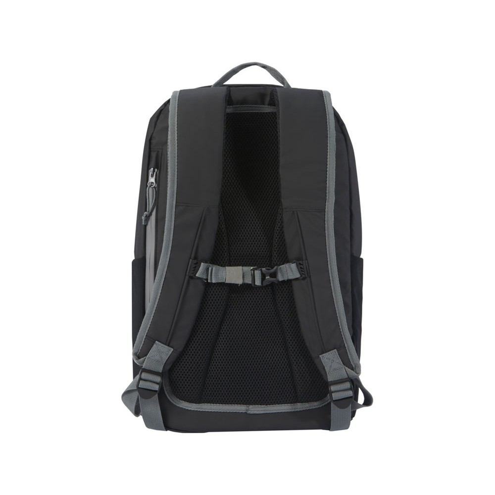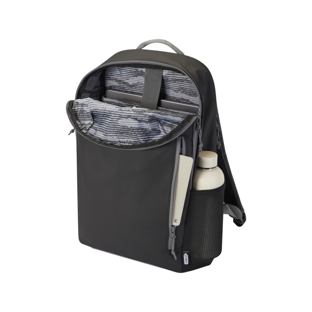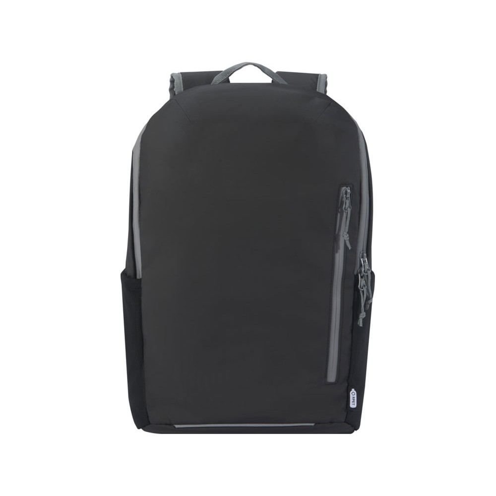 Водонепроницаемый рюкзак для ноутбука, изготовленный из переработанных материалов, сертифицированных согласно стандарту GRS, включая застежки-молнии. Имеет отделение с подкладкой, в которое помещается ноутбук с диагональю 15 дюймов, боковое отверстие для быстрого доступа, несколько сетчатых карманов, передний карман на молнии, а также светоотражающую окантовку для видимости. Формованная мягкая спинка и регулируемый нагрудный ремень обеспечивают комфорт даже тогда, когда рюкзак полностью загружен. Из переработанных материалов, сертифицированных по стандарту GRS, изготовлены основная ткань, подкладка, лямки и застежки-молнии. Емкость: 21 литр. Не содержит ПВХ.