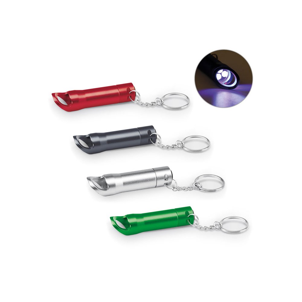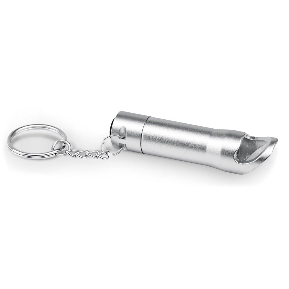 Металлический фонарь с 3 светодиодами, открывалкой и кольцом для ключей. Включает 3 батареи LR44. ø18 x 72 мм
