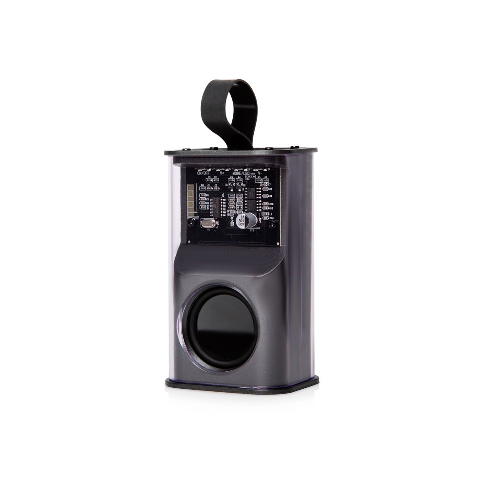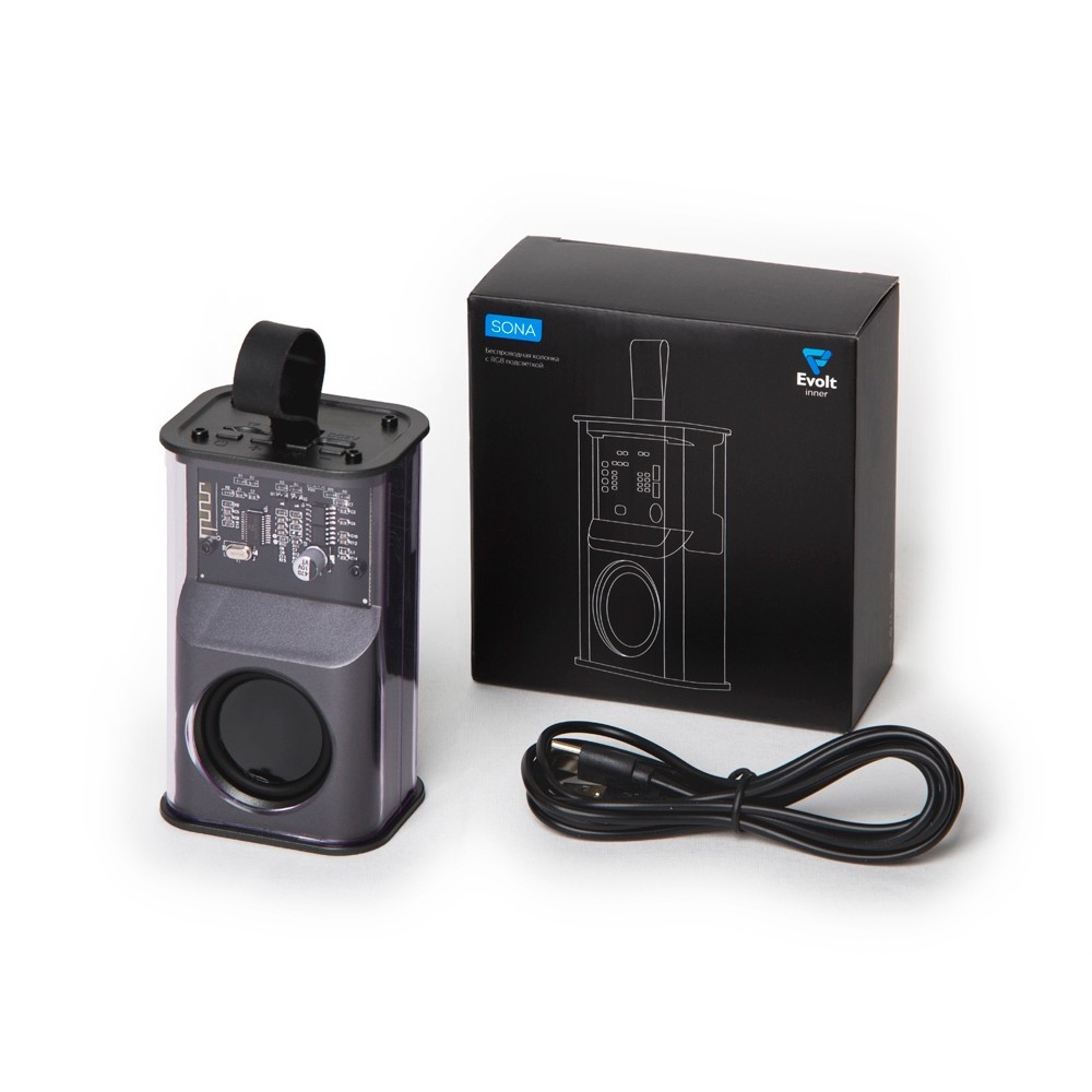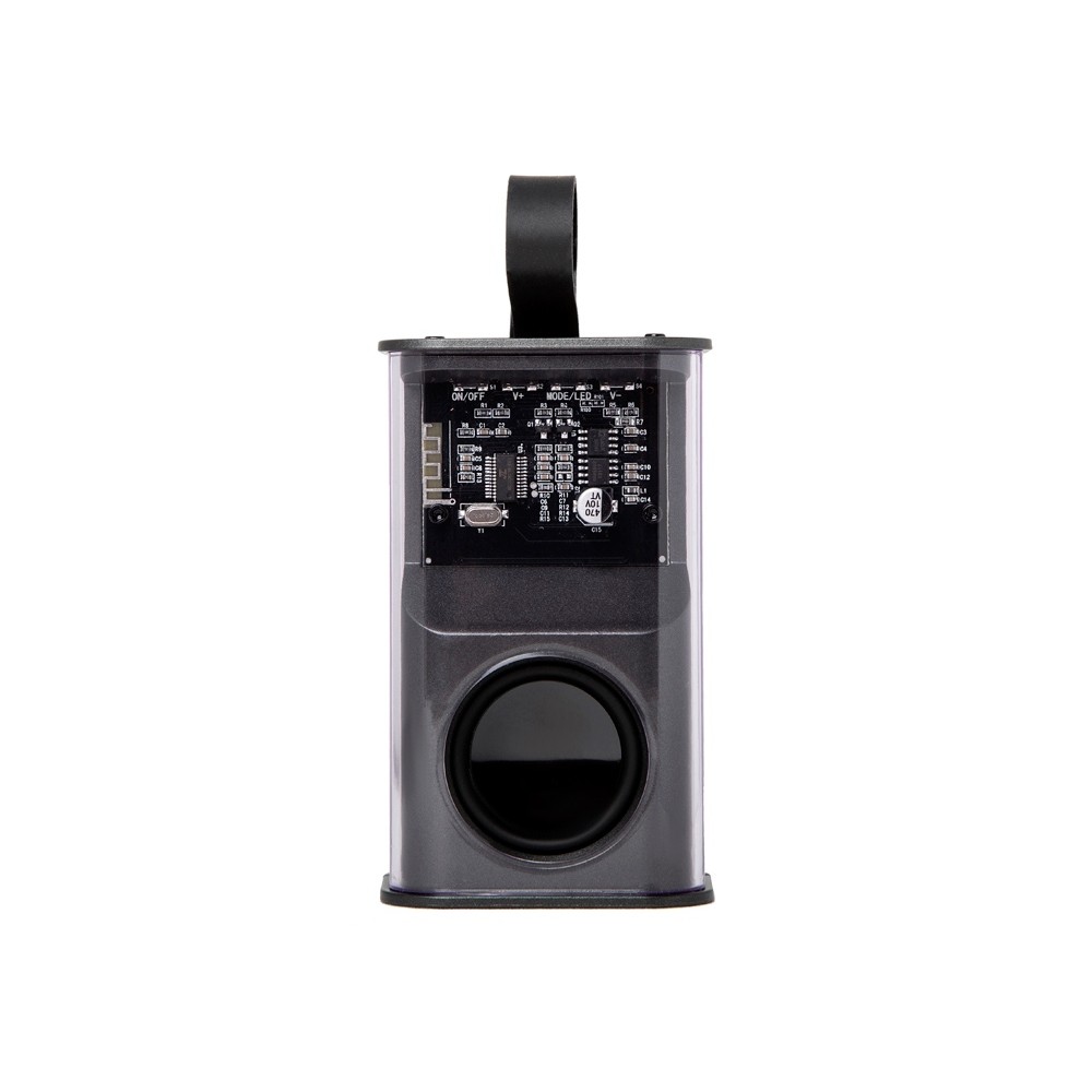 Колонка может работать от 3 до 5 часов на 1 заряде. Силиконовый держатель поможет подвесить колонку на карабин и закрепить на любой сумке, не занимая места внутри. Корпус выполнен из прозрачного пластика. Поставляется в фирменной упаковке.