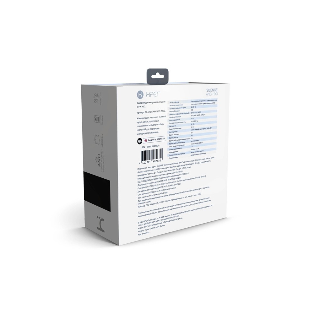 Для качественного звука используются 40-миллиметровые динамики, а сам аксессуар работает на стандартных частотах в диапазоне от 20 до 20000 Гц. Hiper Silence ANC HX3 быстро подключается к мобильным девайсам по беспроводному интерфейсу Bluetooth 5.0 и не теряют соединение на расстоянии до 15 м. При желании можно воспользоваться обычным кабелем, для чего на корпусе предусмотрен разъём 3,5 мм.