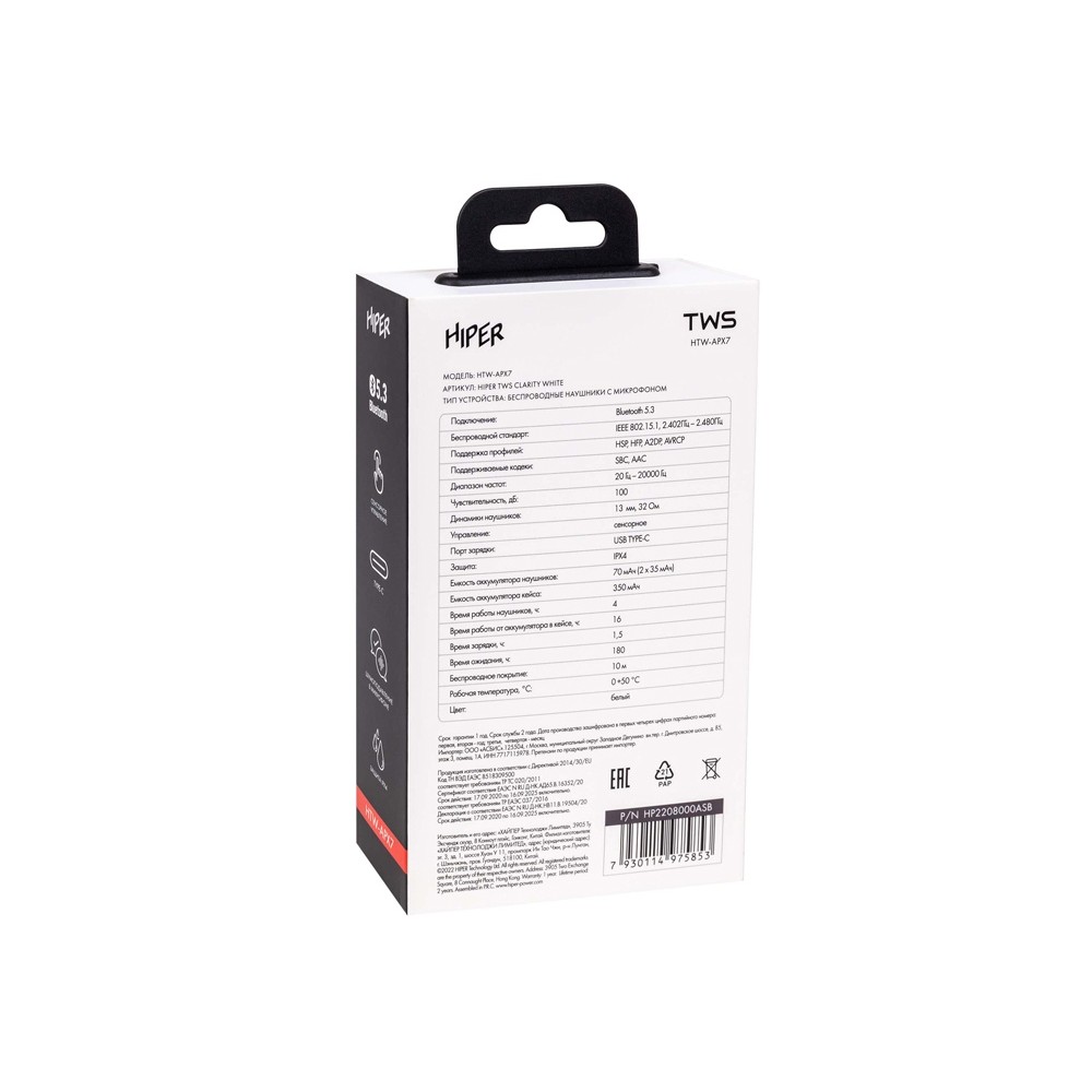 Технические характеристики Наушники беспроводные TWS «Clarity» с шумоподавлением ENC, белый