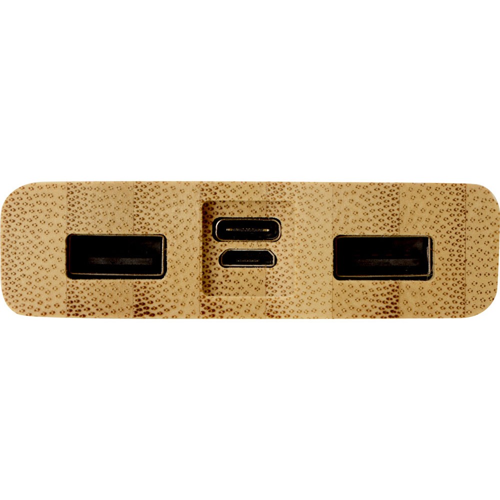 Универсальный повербанк "Bamboo Air" сочетает в себе современные технологии и натуральный материал. Поддерживает беспроводную зарядку совместимых Qi - устройств. Корпус сделан из 100% натурального бамбука без пластиковых вставок. Экологичный материал не только привлекает внимание, но имеет приятный естественный аромат и удобно лежит в руке. Повербанк имеет два выходных USB разъема, два входных разъема micro USB и USB-C и все необходимые кабели в комплекте (USB-C, micro USB и Lightning / iPhone). Полимерной литий-ионной батареи емкостью 10000 мАч в среднем хватит на несколько зарядок смартфона в зависимости от модели (2,5 -3,5 раза). Поставляется в крафт упаковке из переработанной бумаги.