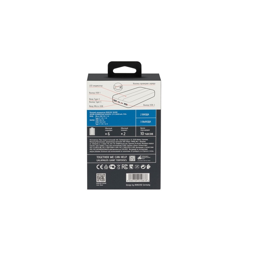 Технические характеристики RIVACASE VA2081 (20000 мАч) внешний аккумулятор, черный 12/24