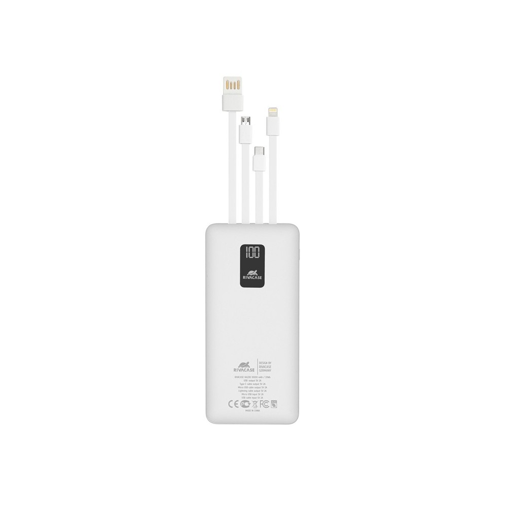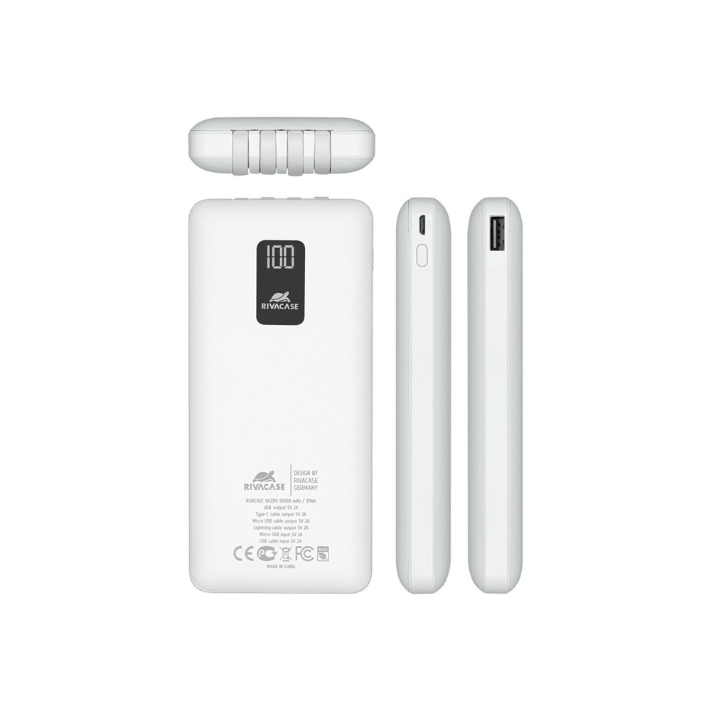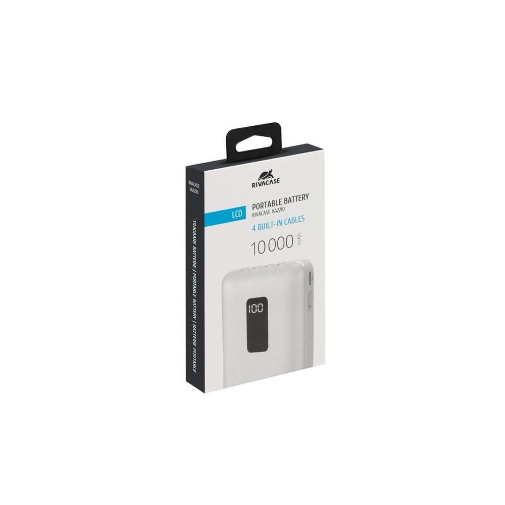 • RIVACASE VA2210 (10000 мАч) внешний аккумулятор с дисплеем и встроенными кабелями, белый, 12/48