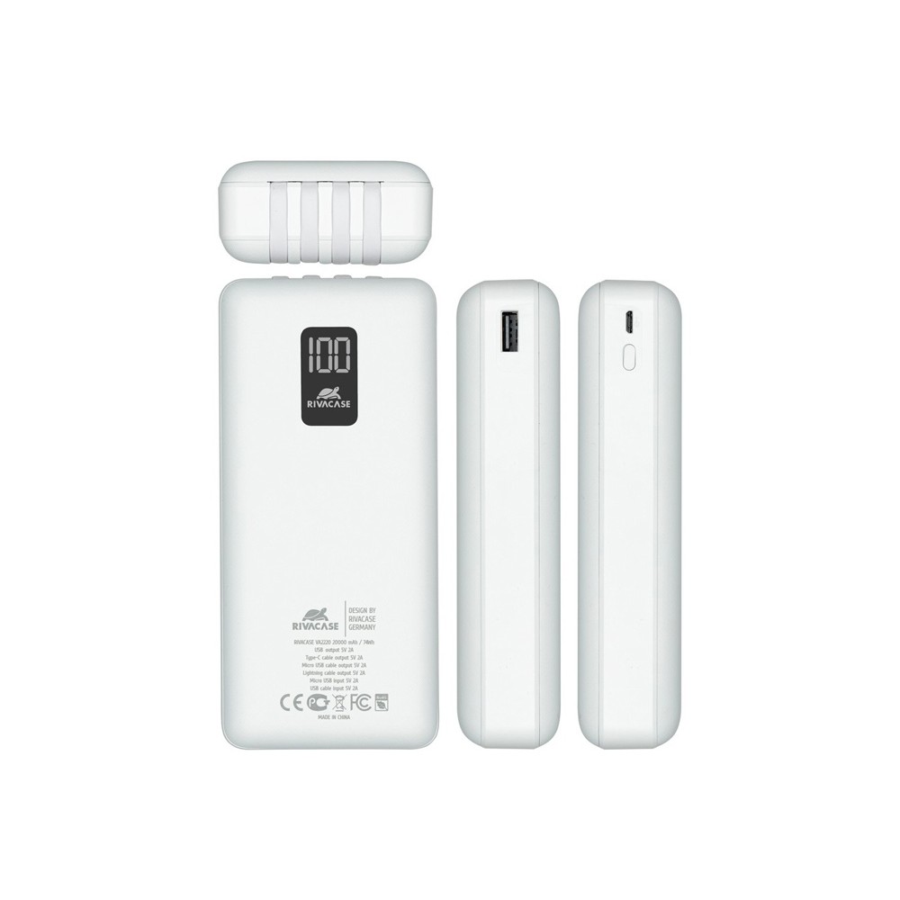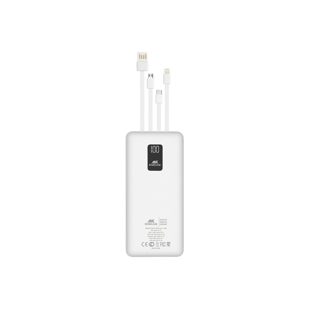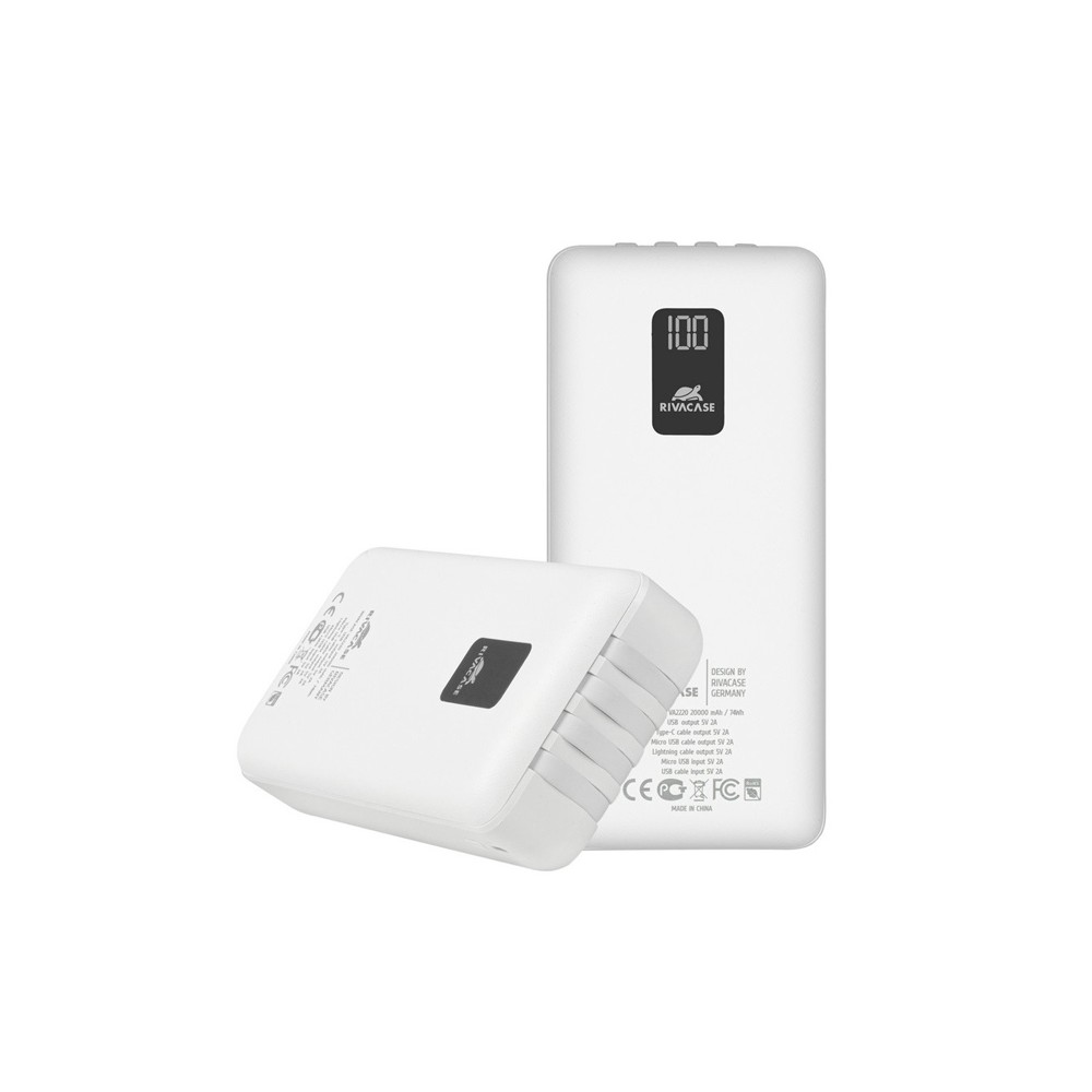 • RIVACASE VA2220 (20000 мАч) внешний аккумулятор с дисплеем и встроенными кабелями, белый, 12/24