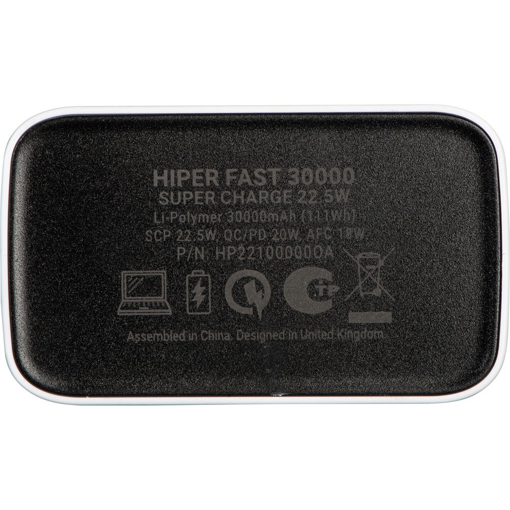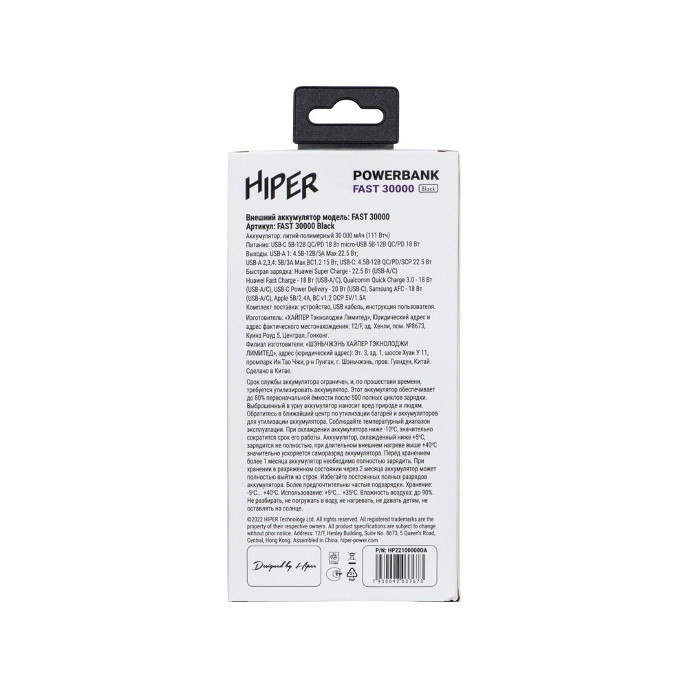 Портативный внешний аккумулятор HIPER FAST 30000 емкостью 30000 мАч (111Втч) оснащён двунаправленным портом USB-C, Micro-USB входом для зарядки, с поддержкой быстрой зарядки аккумулятора QC и PD, 4xUSB-A выходами, максимальный выходной ток 5А, максимальная мощность 22,5 Вт, поддержка быстрой зарядки стандарта QC 18 Вт, поддержка быстрой зарядки стандарта PD 18 Вт, стильный дизайн.