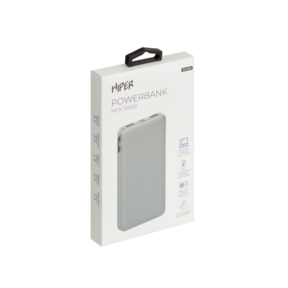 Портативный внешний аккумулятор HIPER MFX 10000 емкостью 10000 мАч (37Втч) оснащён двунаправленным портом USB-C, Micro-USB входом для зарядки, с поддержкой быстрой зарядки аккумулятора QC и PD, 2xUSB-A выходами, максимальный выходной ток 3.0А, максимальная мощность 18 Вт, поддержка быстрой зарядки стандарта QC 18 Вт, поддержка быстрой зарядки стандарта PD 18 Вт.