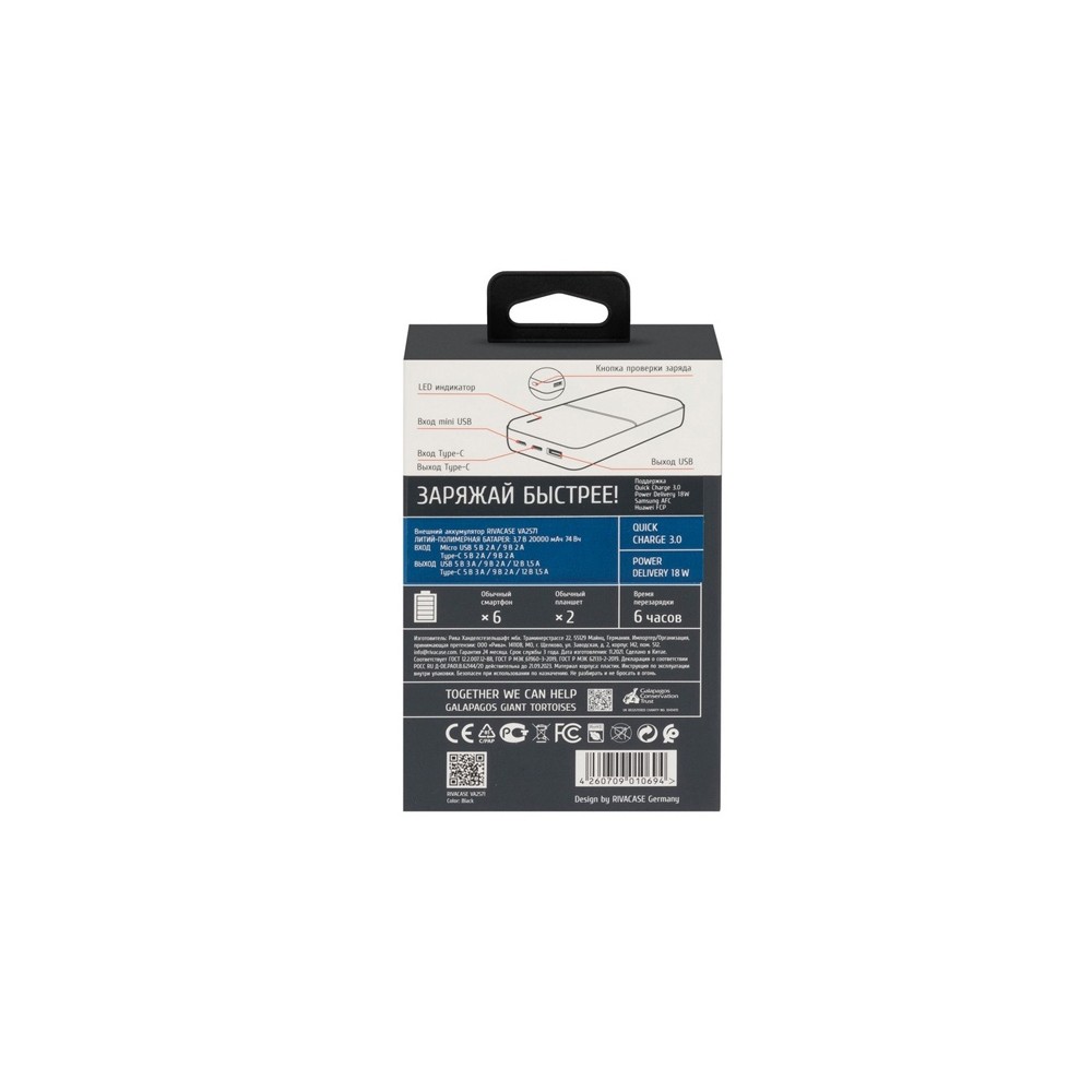Технические характеристики RIVACASE VA2571 (20000 мАч) QC/PD внешний аккумулятор, черный 12/24