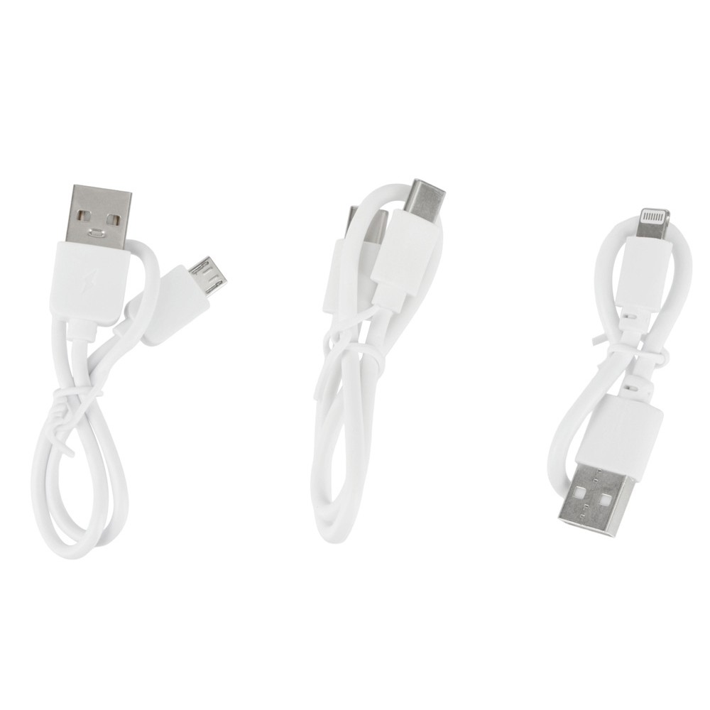 Комплектностьпортативное зарядное устройство, USB кабель 2-в-1 (Type-C, Lightning) или три кабеля по отдельности (Micro, Type-C, Lightning), инструкция Материал товарапластик с покрытием софт-тач Материалы товараsoft-touch/софт-тач, пластик