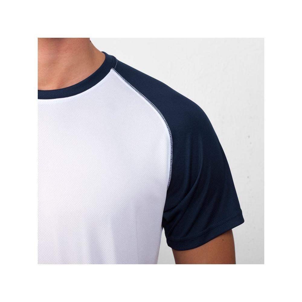 Спортивная футболка с контрастным рукавом реглан. Круглый вырез горловины с контрастной тесьмой. Технологическое дышащее полотно.