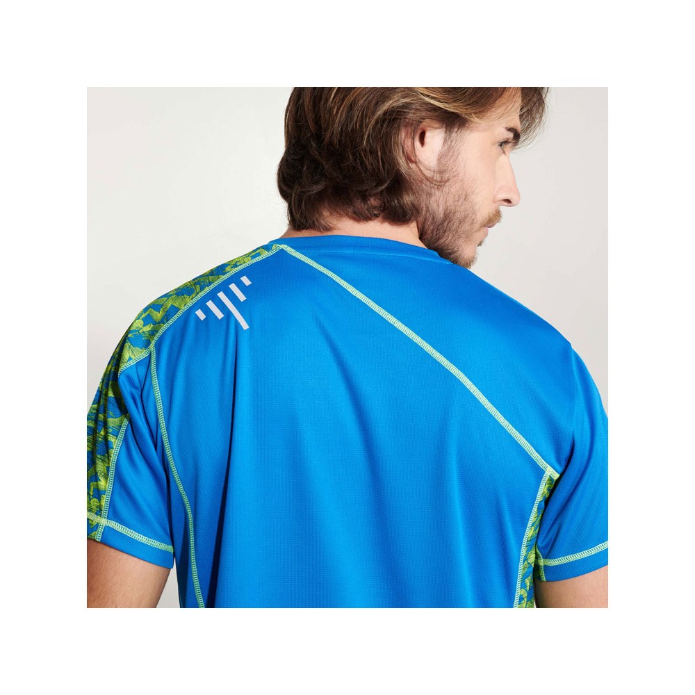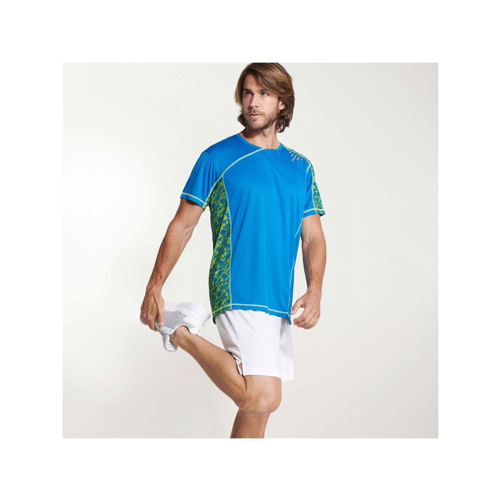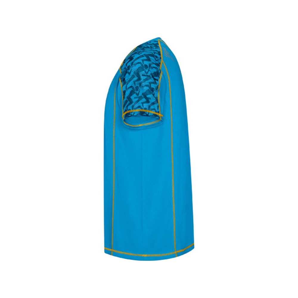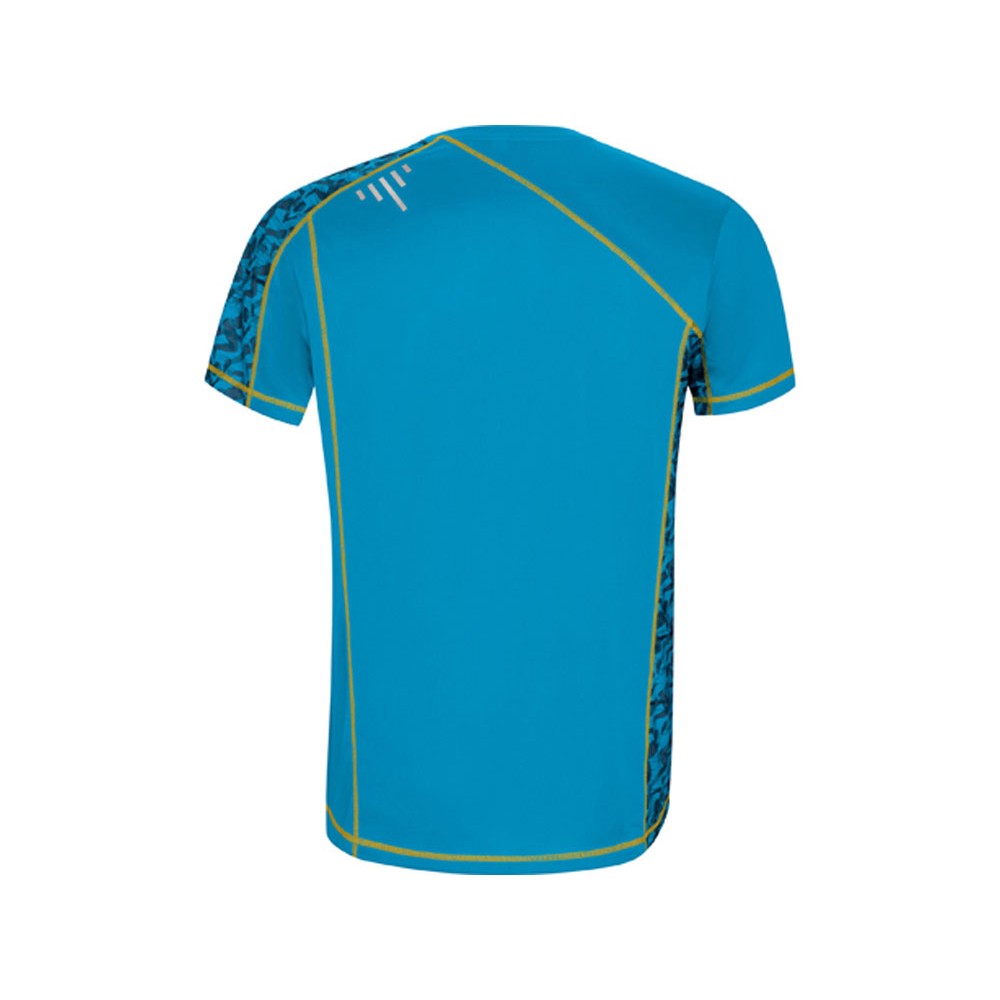 Спортивная футболка с коротким рукавом и принтованными вставками. Контрастные отстрочки плоским швом, светоотражающие элементы на полочке и спинке. Эко лейбл на рукаве.