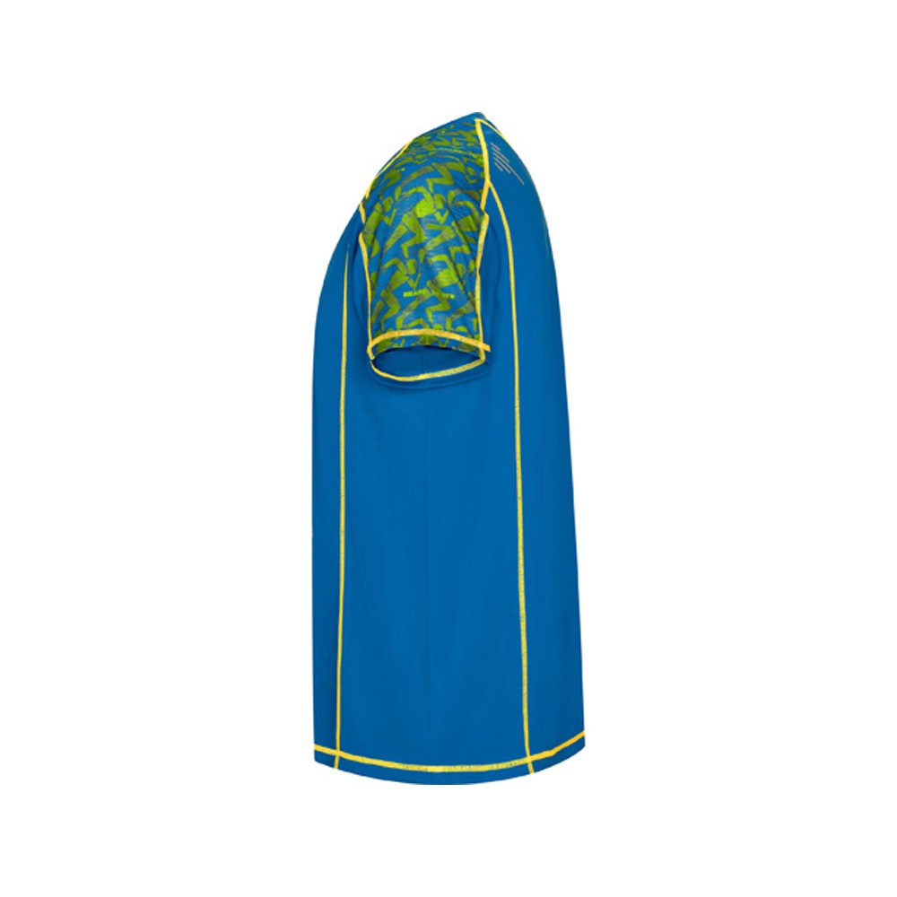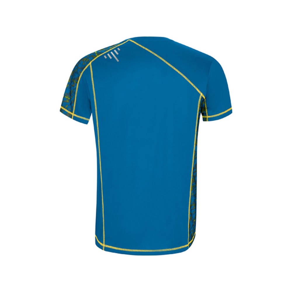Спортивная футболка с коротким рукавом и принтованными вставками. Контрастные отстрочки плоским швом, светоотражающие элементы на полочке и спинке. Эко лейбл на рукаве.