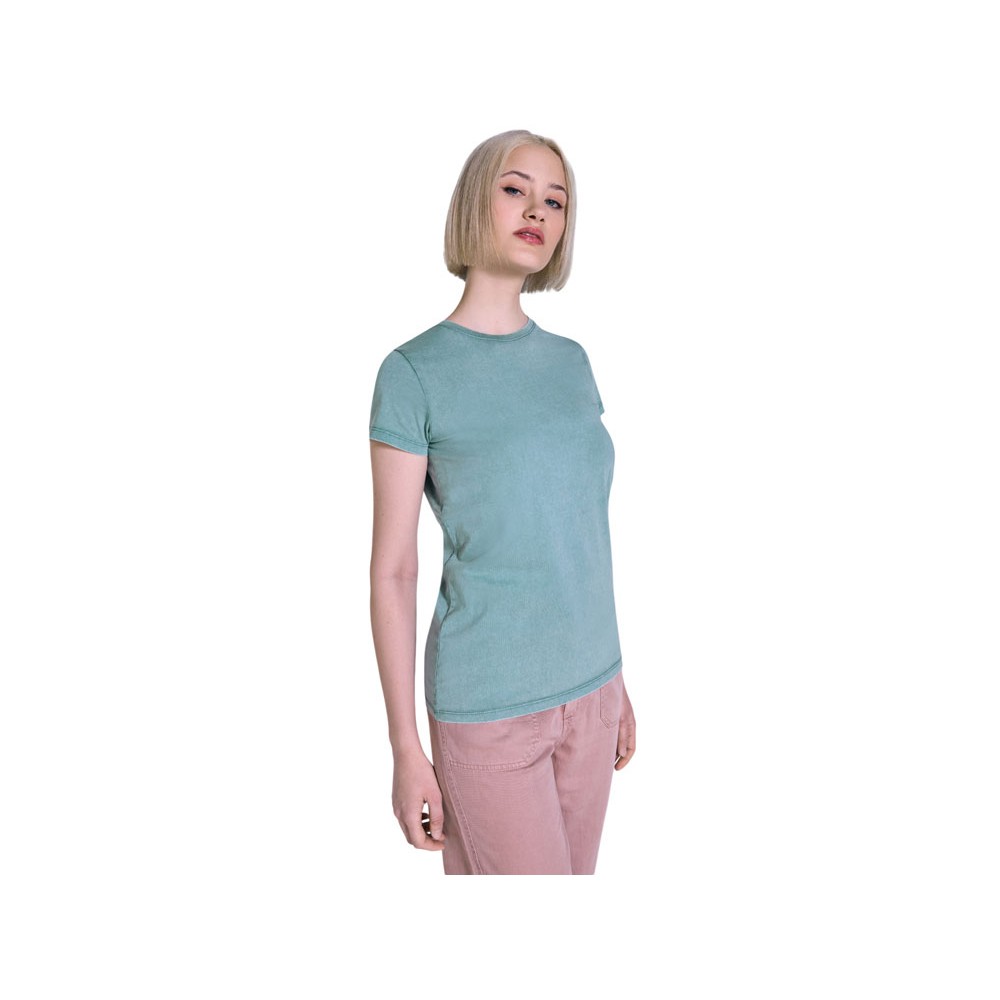 Женская футболка с коротким рукавом из 100% хлопка с аксидной стиркой. Круглый вырез горловины из риба 1х1. Отстрочка в тон по горловине.
