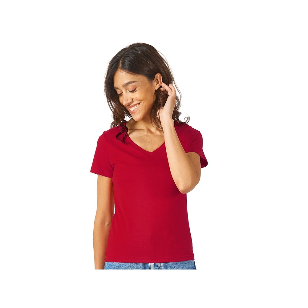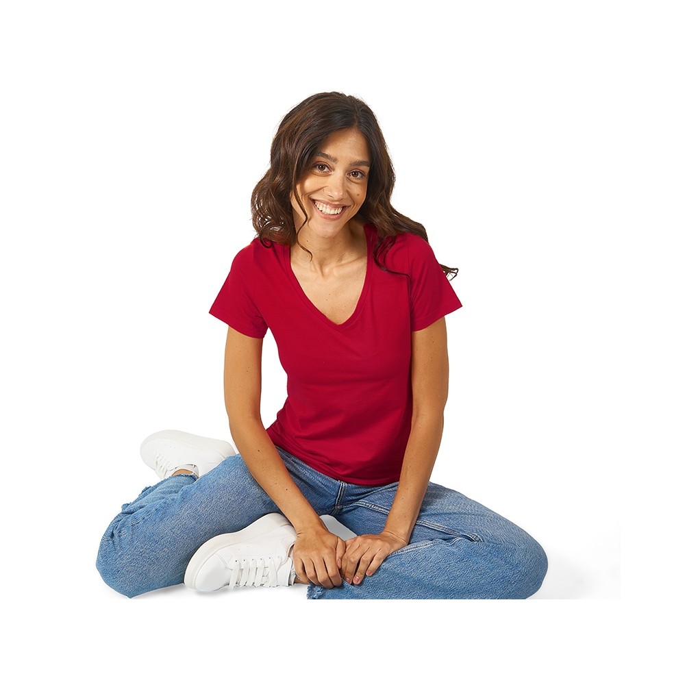 Женская футболка из натурального хлопка с элегантным V-образным вырезом. Материал отлично подходит для нанесения рекламной информации. Натуральная ткань не вызывает раздражения кожи.