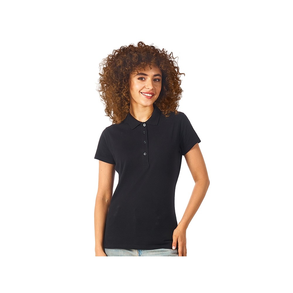 Женская рубашка-поло First. Воротник 1х1. Обшивка внутри воротника. Мужская и детская модели с 2 пуговицами, женская - с 4 пуговицами. Пуговицы с гравировкой в тон. Пике, 100% хлопок. 160 г/м2.
