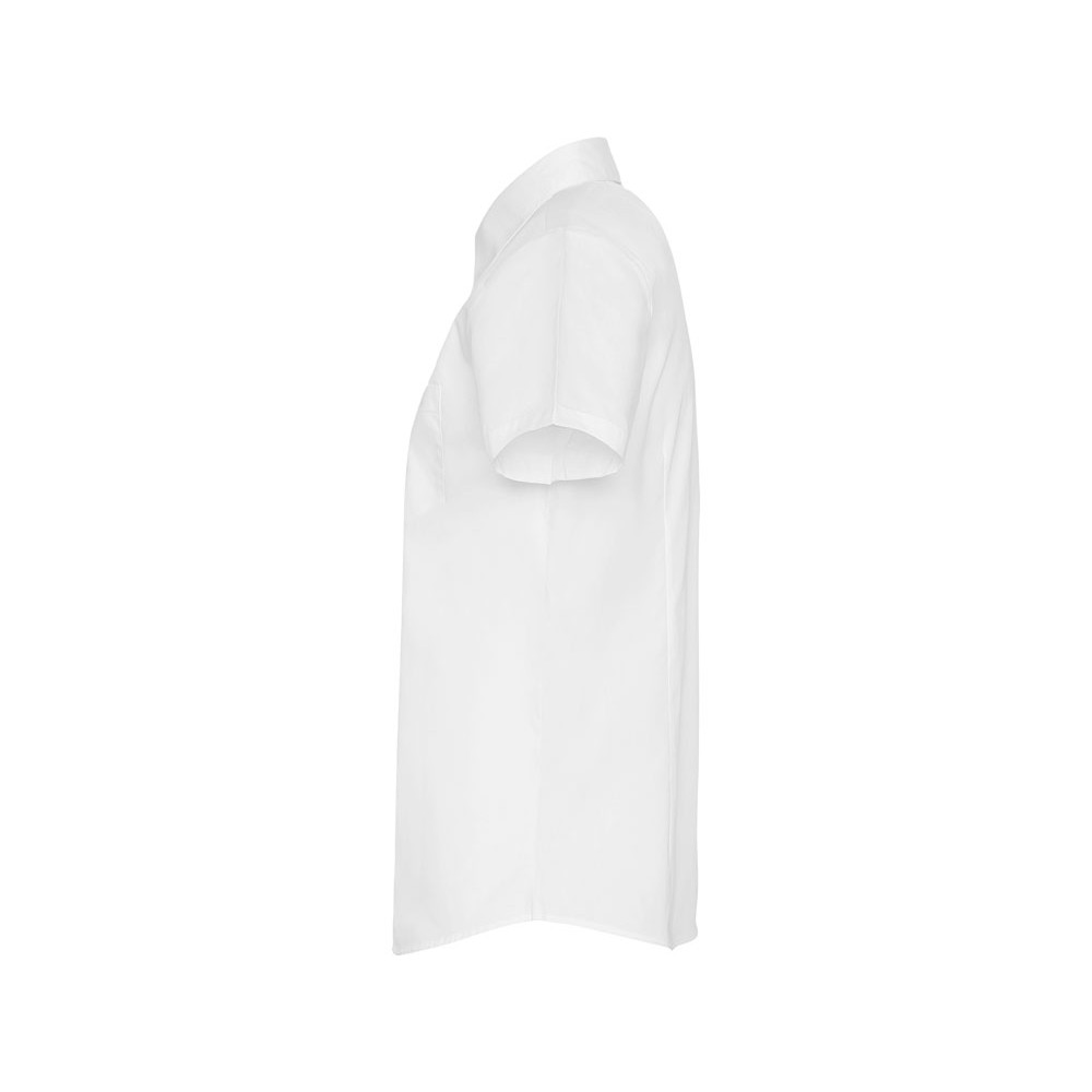 Рубашка женская прилегающего силуэта с вытачками на полочке и спинке с коротким рукавом. Накладной карман на груди слева, закругленный низ изделия. Планка с потайными пуговицами.