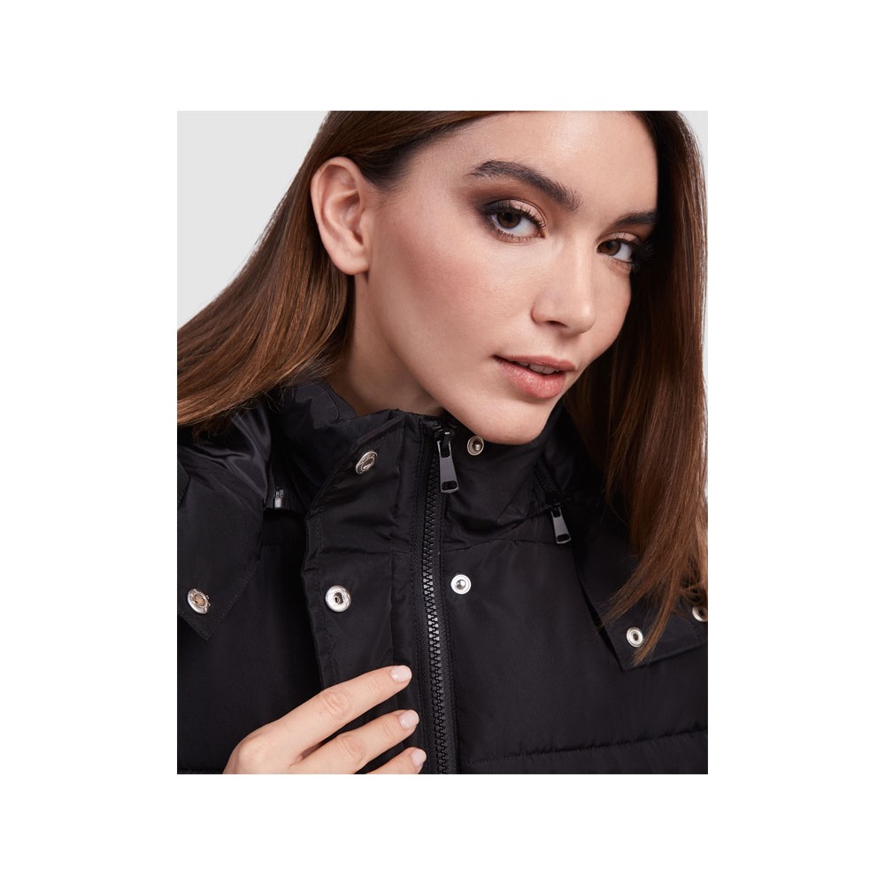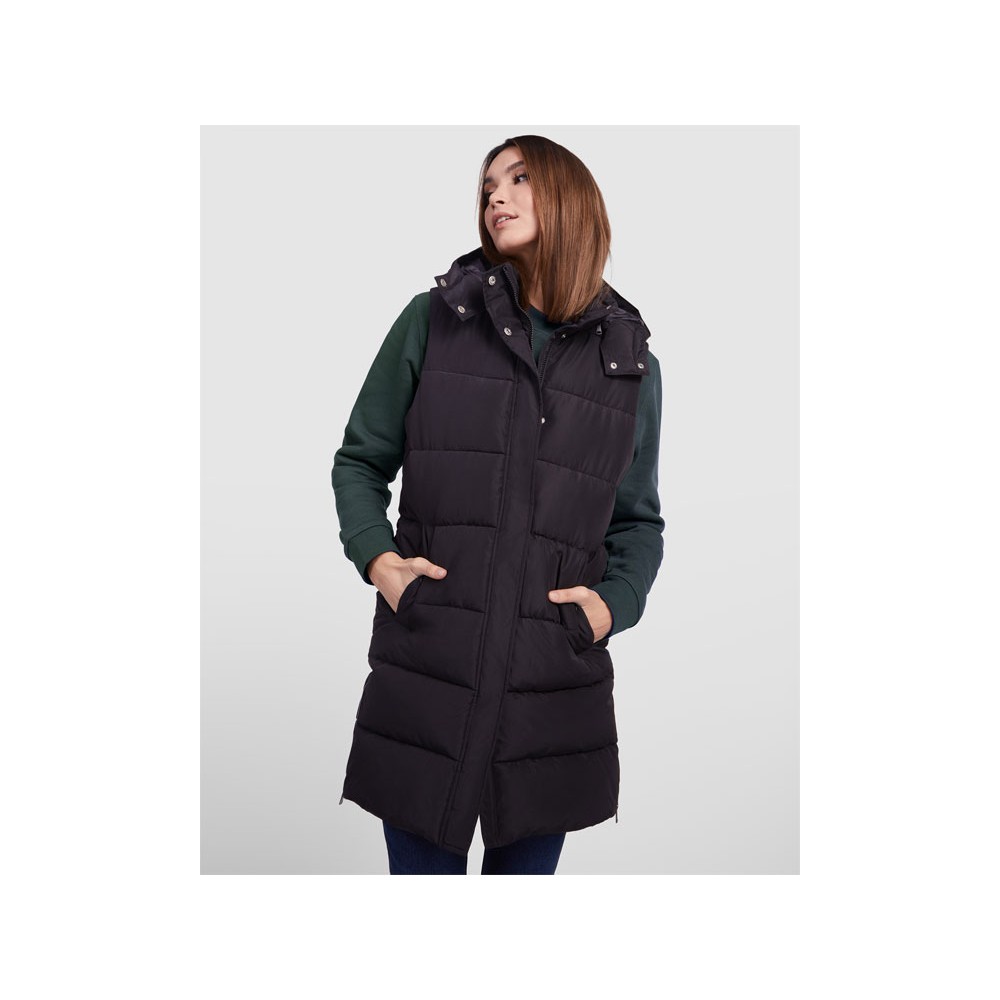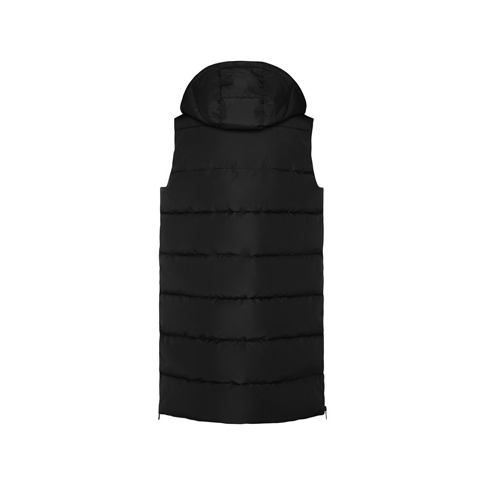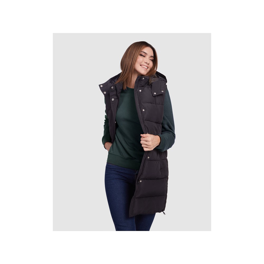 Женский стеганый жилет со съемным капюшоном.