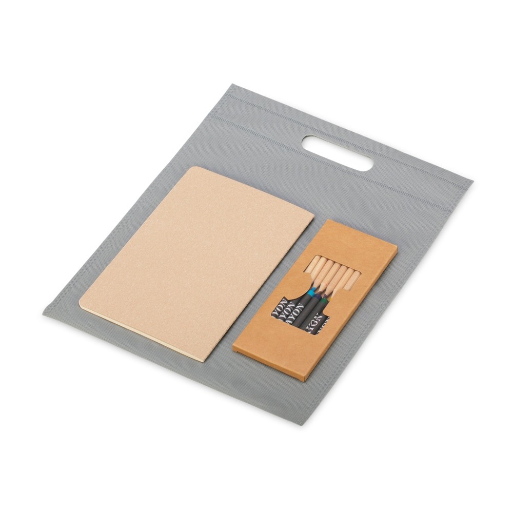 Комплектность блокнот А5 14 х 21 х 0,3 см, набор карандашей 18,2 х 7,7 х 0,9 см, шоппер 28 х 35,5 см