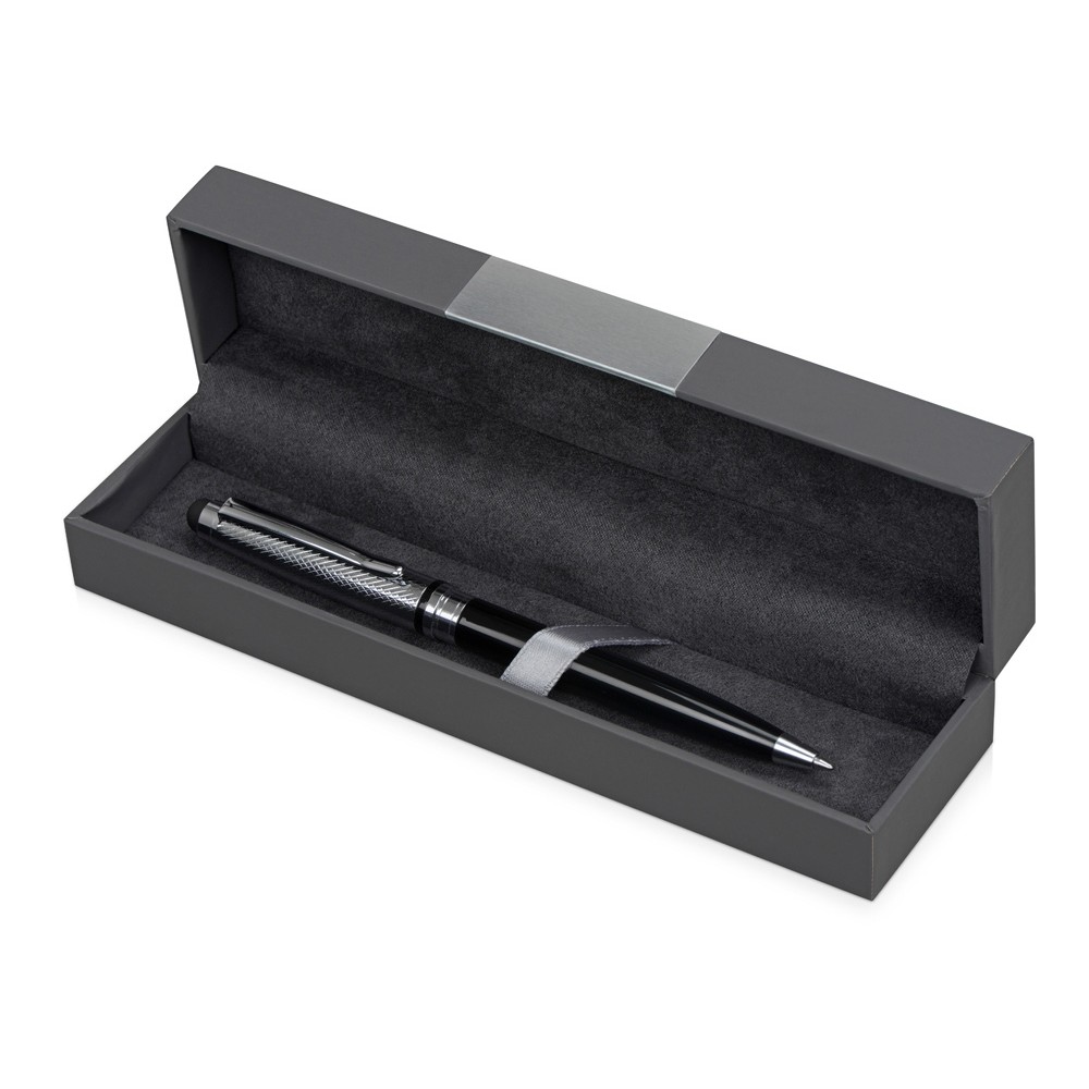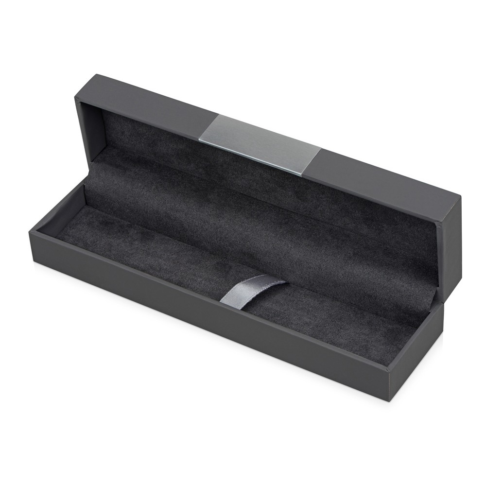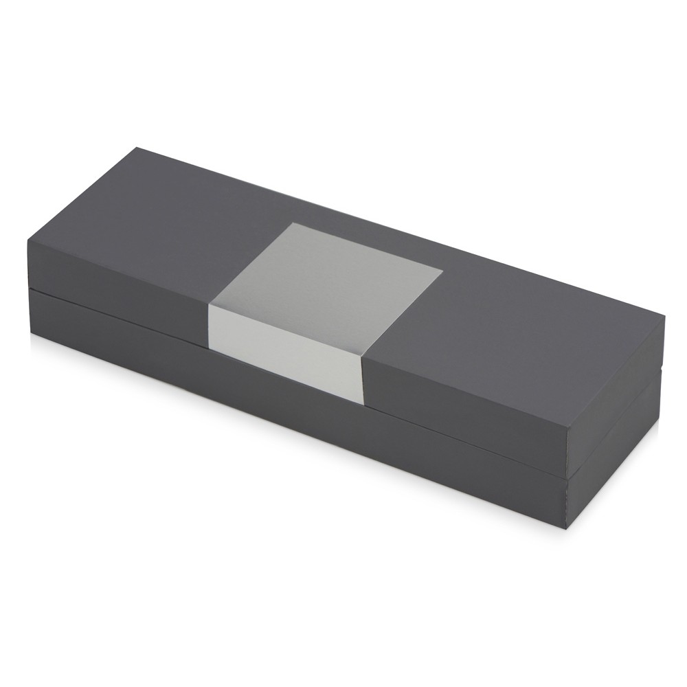 Футляр для ручки изготовлен из прочного картона с матовым покрытием, имитирующим кожу. Декоративная серебристая вставка придаёт футляру премиальный вид. Внутренняя часть отделана велюром, на котором ручка фиксируется при помощи атласной ленты.