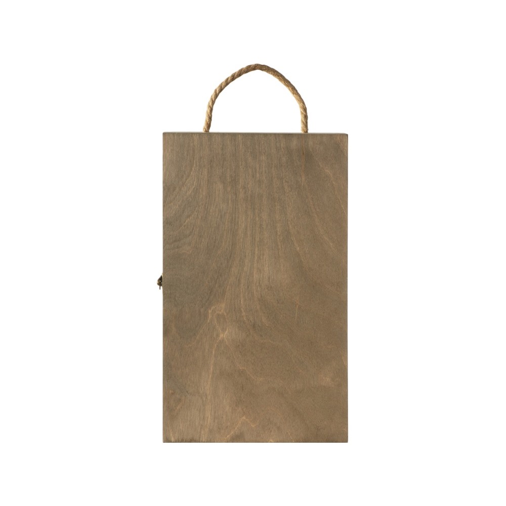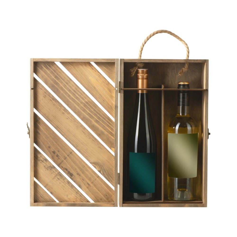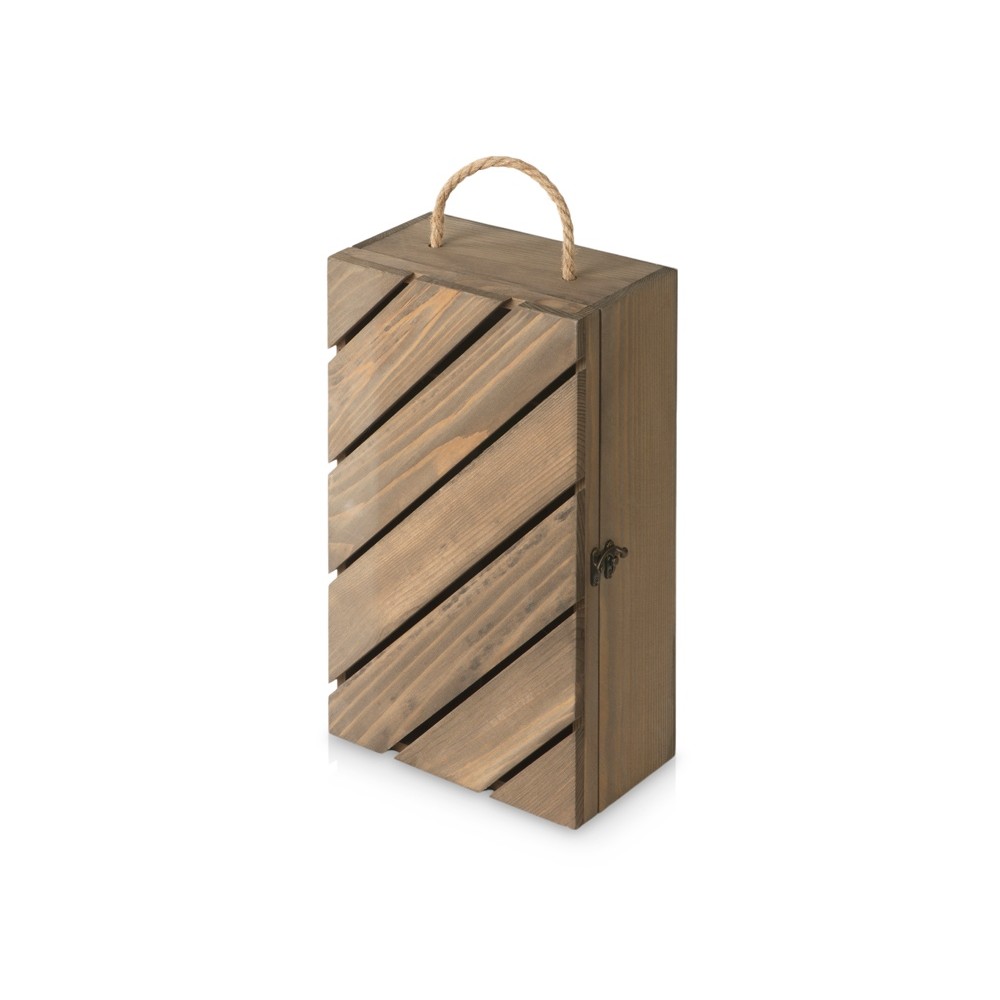 Коробка вмещает в себя две стандартные бутылки вина. Надёжное крепление убережёт бутылки от ударов и не даст им перемещаться внутри коробки.