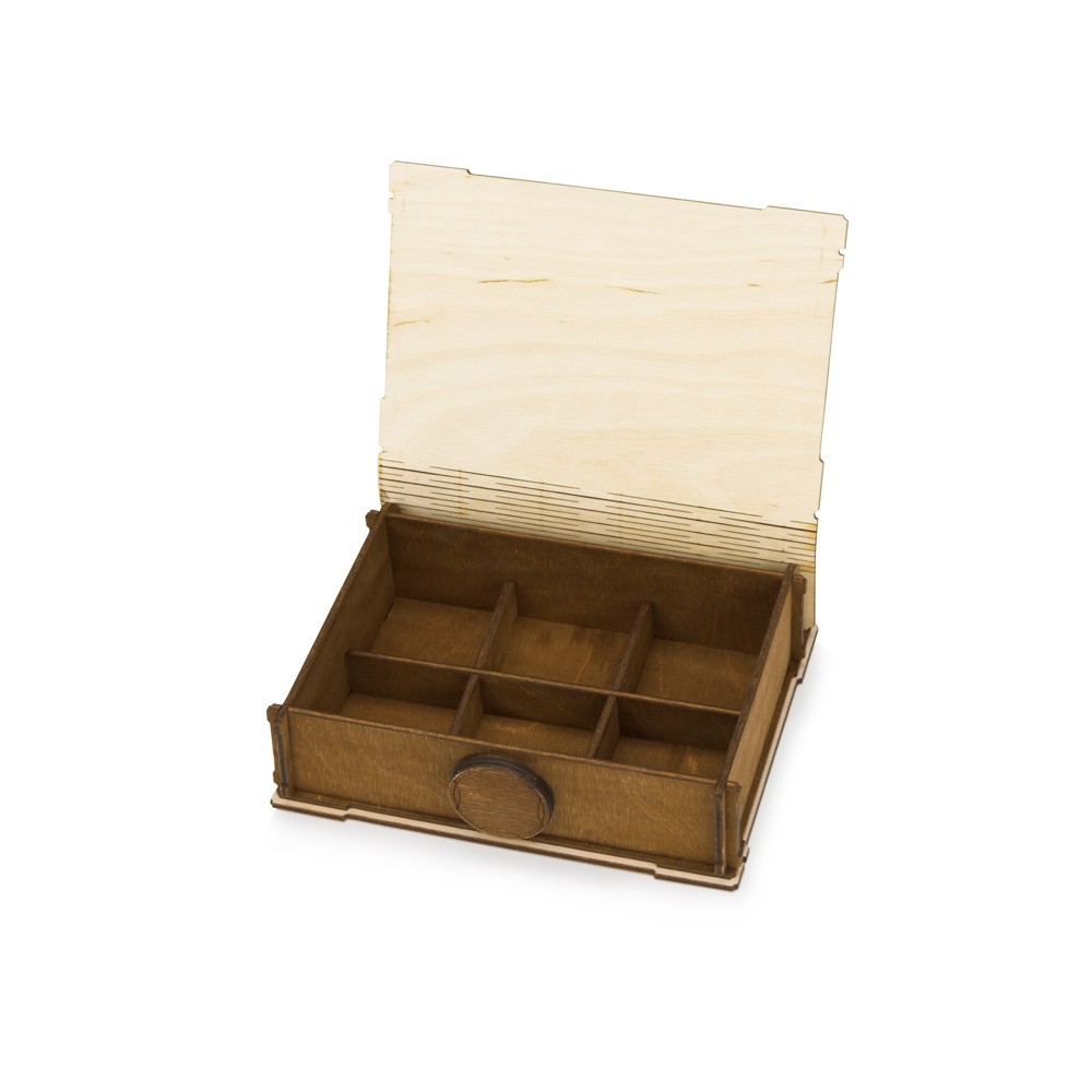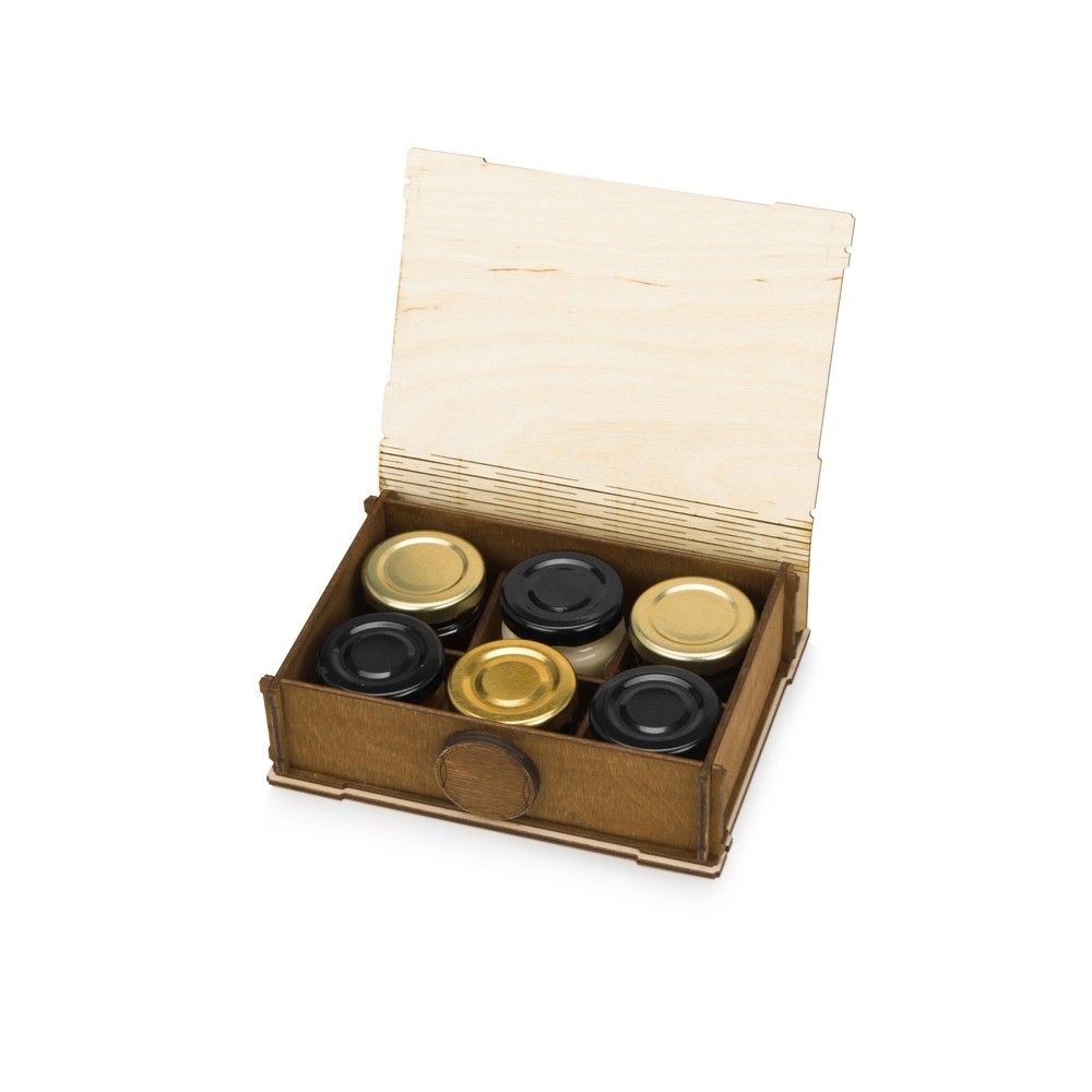 Подарочная коробка «Тайна» - это шести секционная деревянная коробка, в которой сувениры надежно фиксируются с помощью крышки и резинки. Коробка изготовлена из экологически чистых материалов - березовой фанеры. Внутри упаковки находится деревянная перегородка, которая легко убирается и тогда коробка становится настоящей шкатулкой для ювелирных изделий, бижутерии, косметики, часов, а также подойдет для хранения различных товаров рукоделия: пуговиц, бисера, ниток, лент, тесьмы и др. Форма, материал и стильное исполнение подарка позволяет занять ему достойное место в интерьере офиса, дома или дачи. На крышке коробки можно сделать нанесение вашего логотипа или промо информации с пожеланиями, тем самым подчеркнуть эстетическую значимость презента. Содержимое подарочной упаковки можно наполнить баночками с вареньем и медом из нашего каталога.