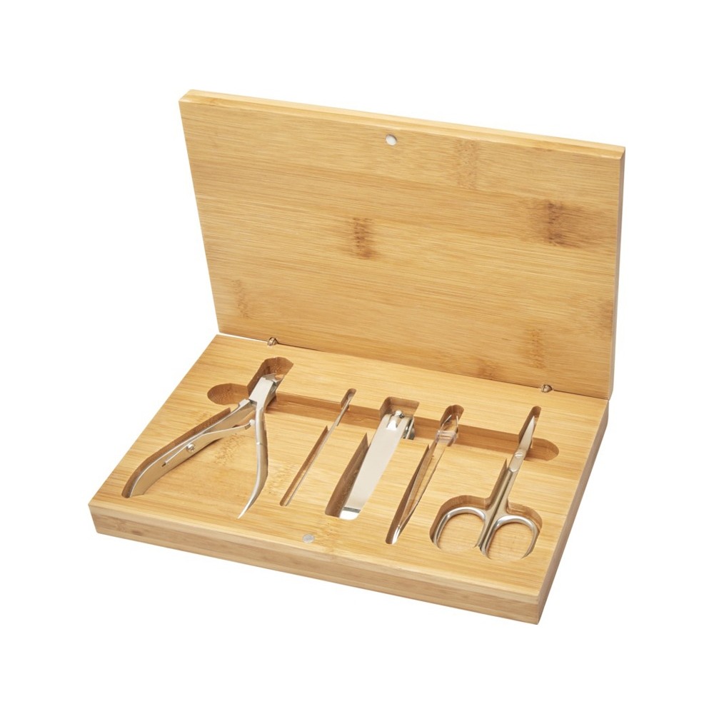 Высококачественный, красиво сделанный бамбуковый набор для маникюра, в который входят: ножницы для кутикул (10,3 x 4,3 x 1 см), ушной пинцет (8 см), кусачки для ногтей пальцев рук и ног (8 x 1,5 x 1,5 см), пинцет (8,5 x 0,7 см) и ножницы (9,5 x 4,2 см). Используемый бамбук поставляется и производится в соответствии со стандартами устойчивого развития.