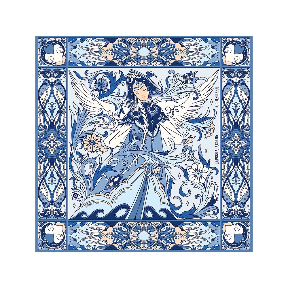 Дизайнерский платок «Царевна Лебедь» от Нины Ручкиной стал воплощением сказочного персонажа, прославленного великим и талантливым романтиком и поэтом — А. С. Пушкиным. Именно он впервые подарил нам образцы художественной русской эстетики, исходящей из самой глубины русской души.