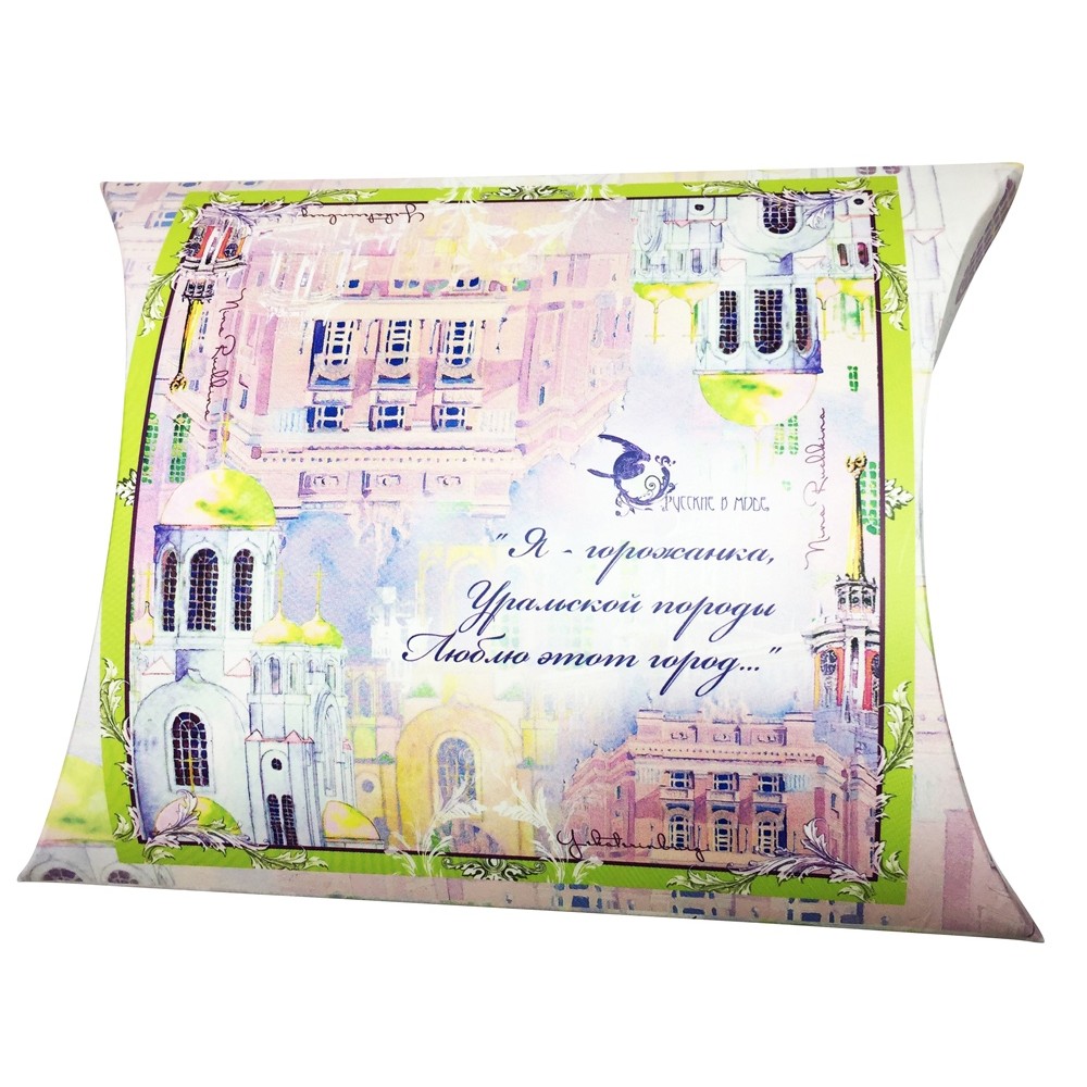 На платке изображены "Храм-Памятник на Крови во имя Всех святых, в земле Российской просиявших", здание Администрации города Екатеринбурга, Екатеринбургский Государственный академический Театр Оперы и Балета.